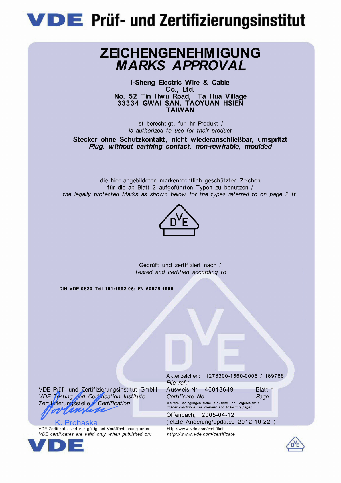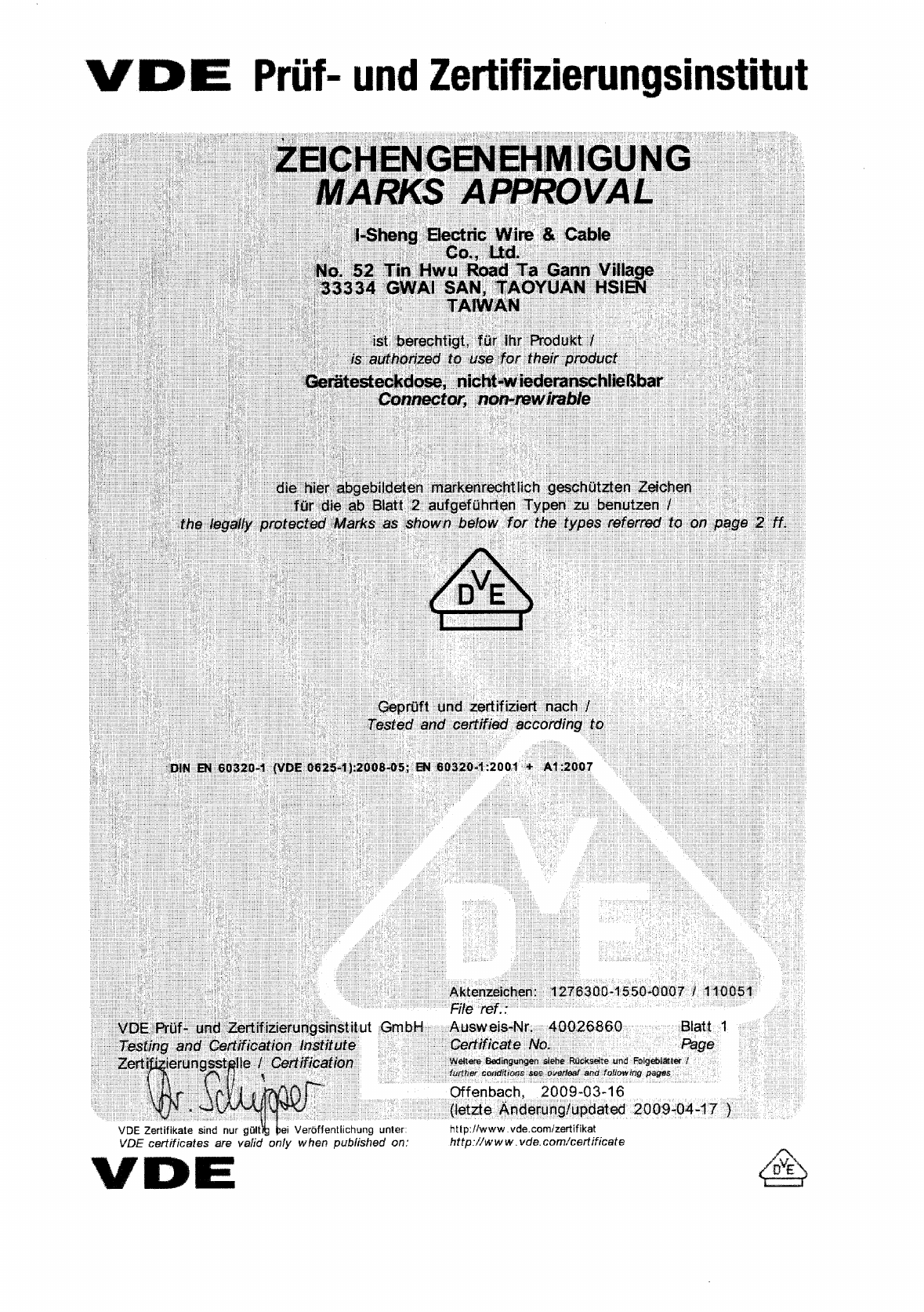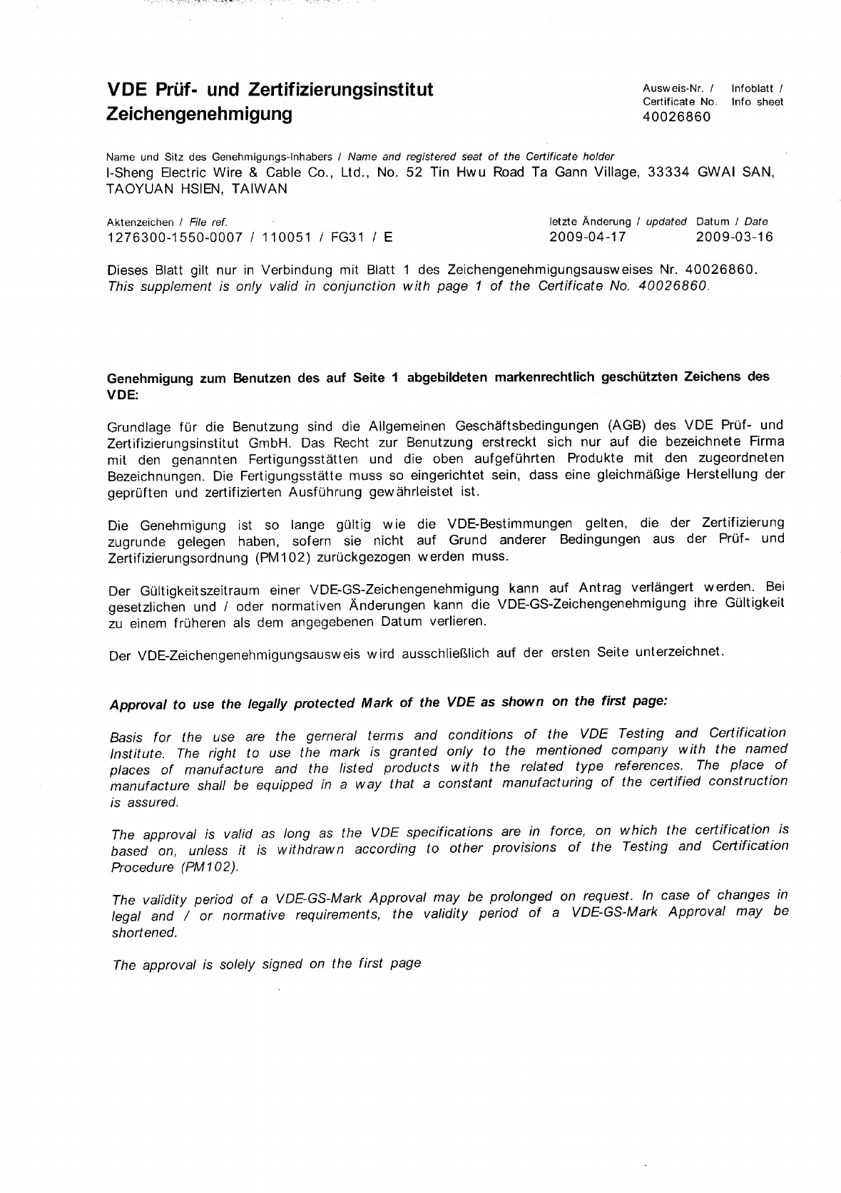 Approval to use the legally protected Mark of the VDE as shown on the first page: