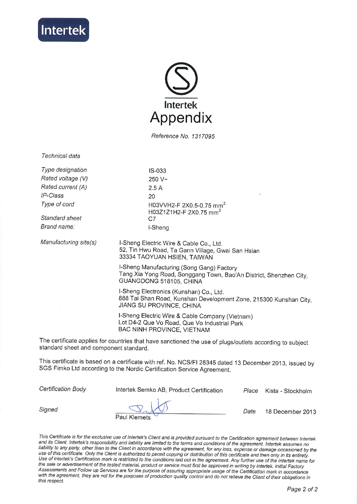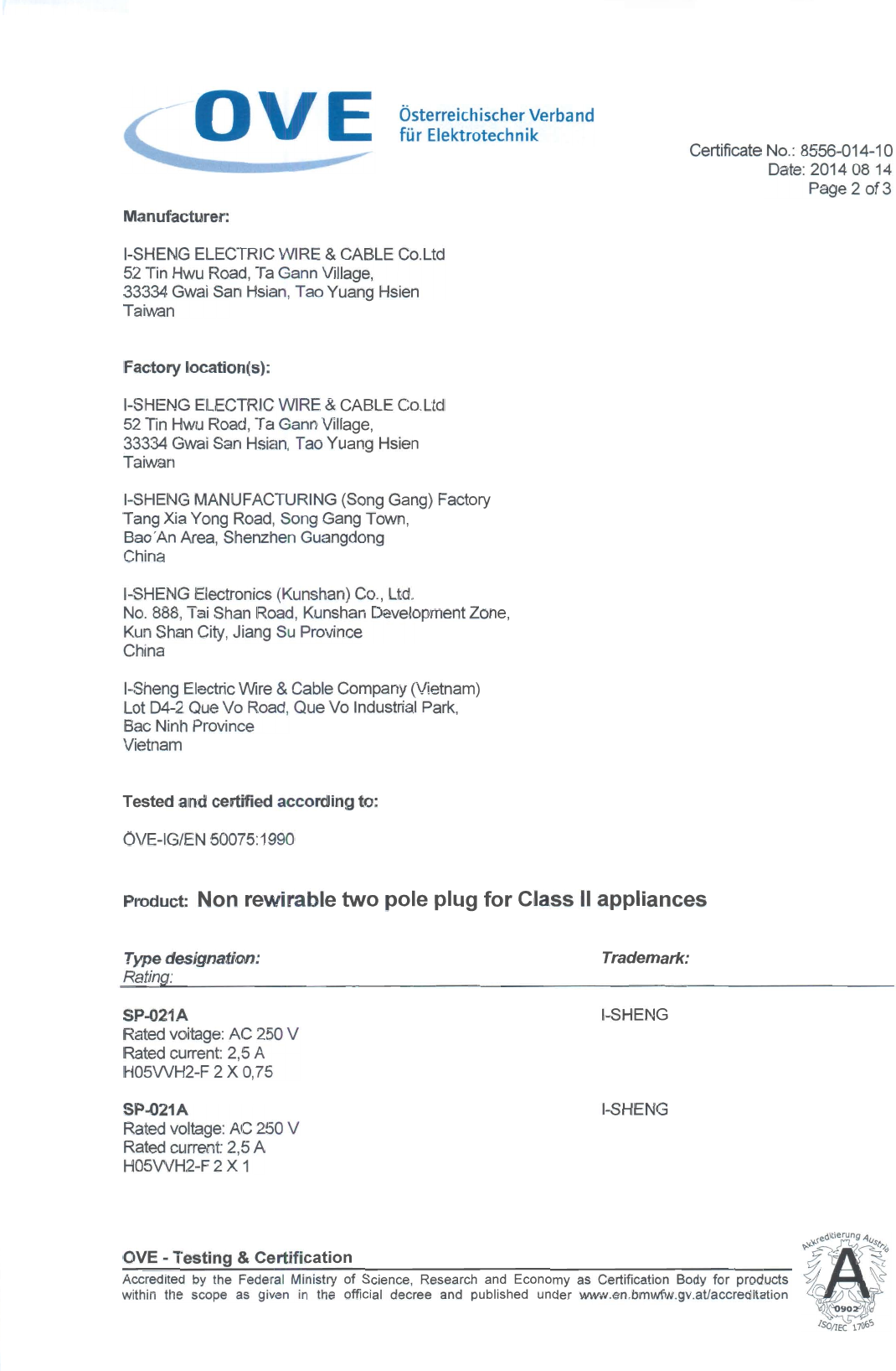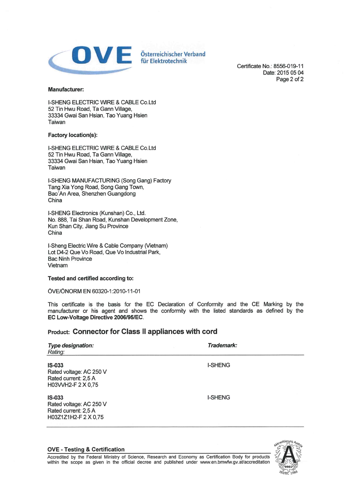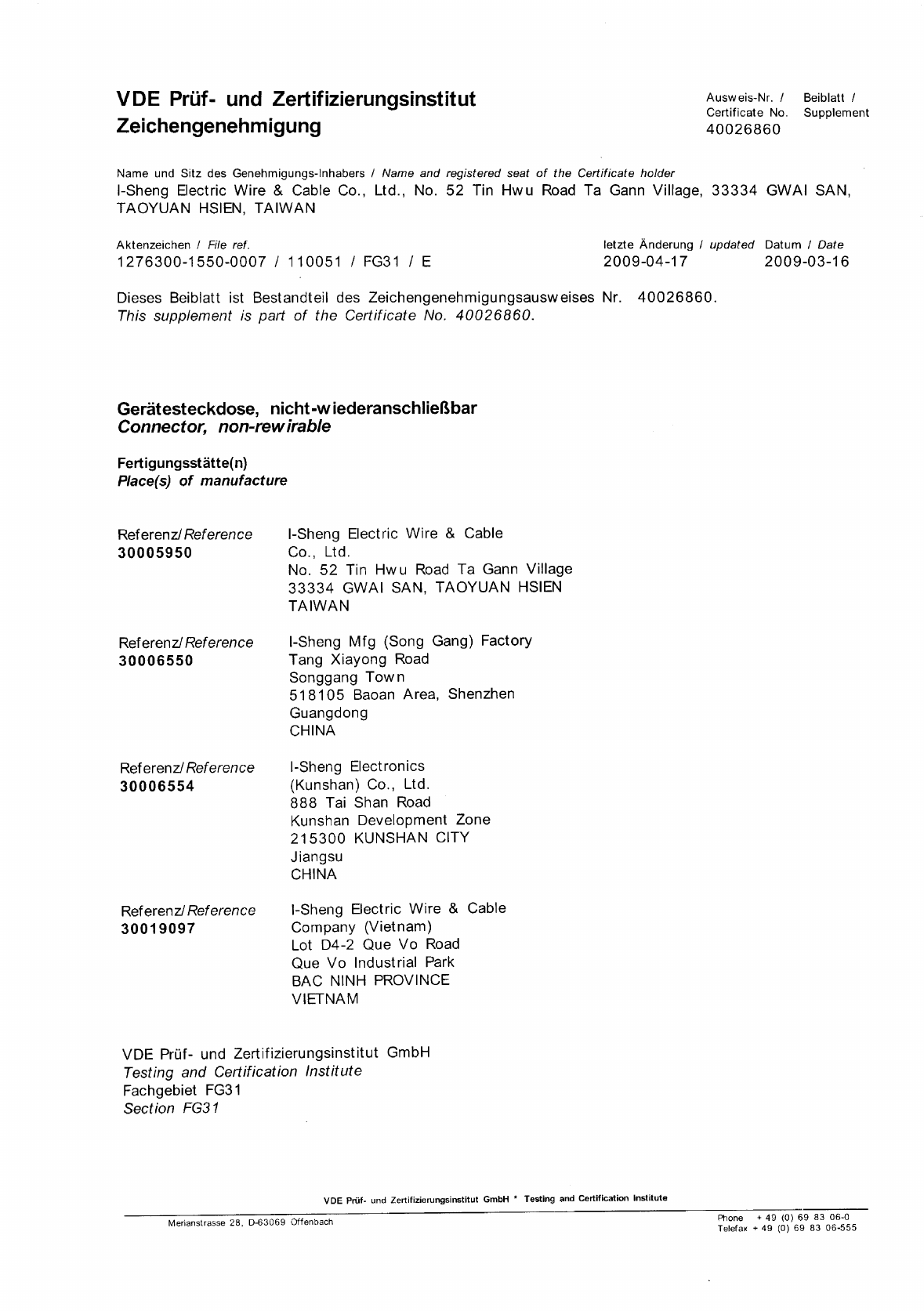 Referenz/Reference I-Sheng Electric Wire & Cable