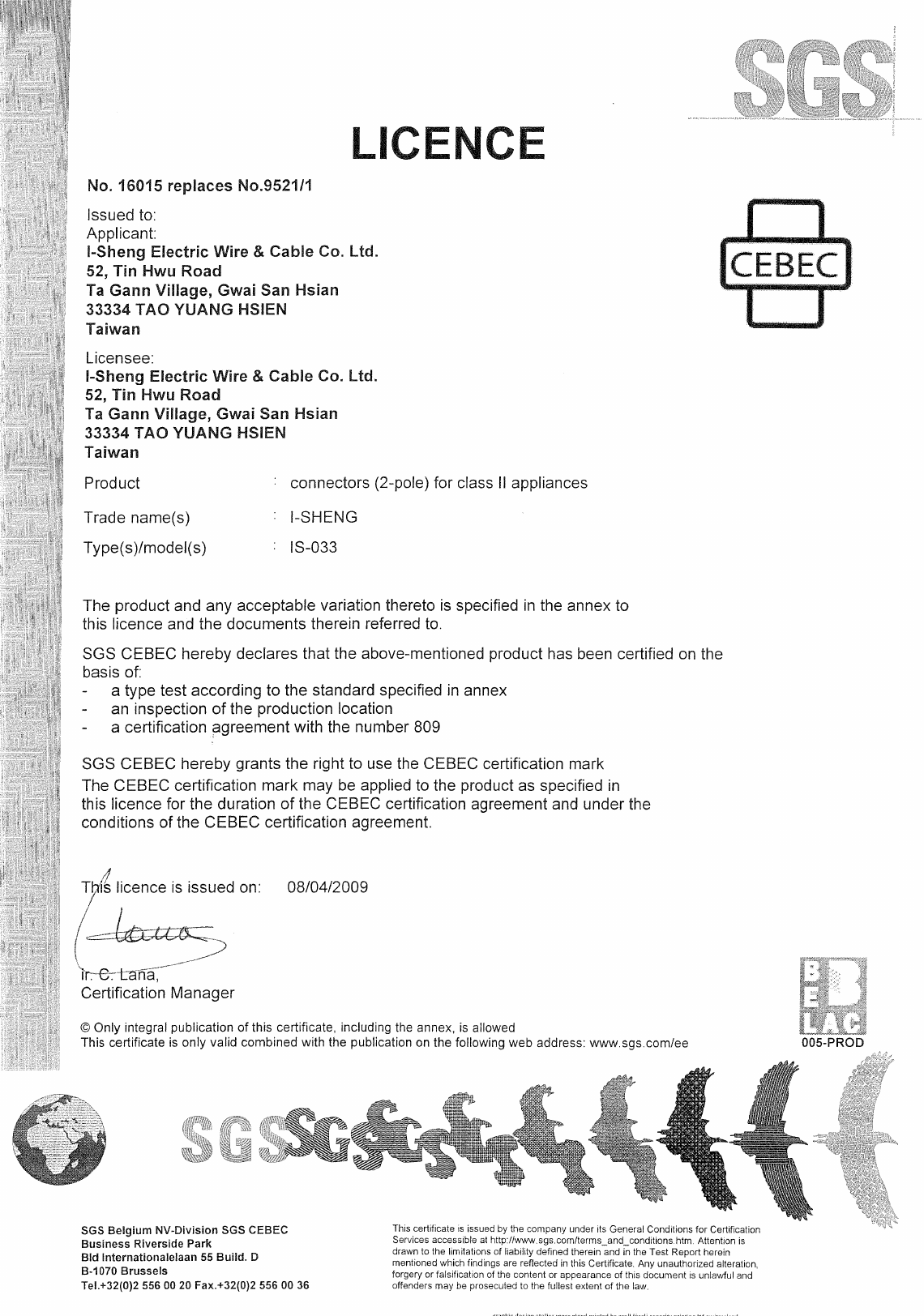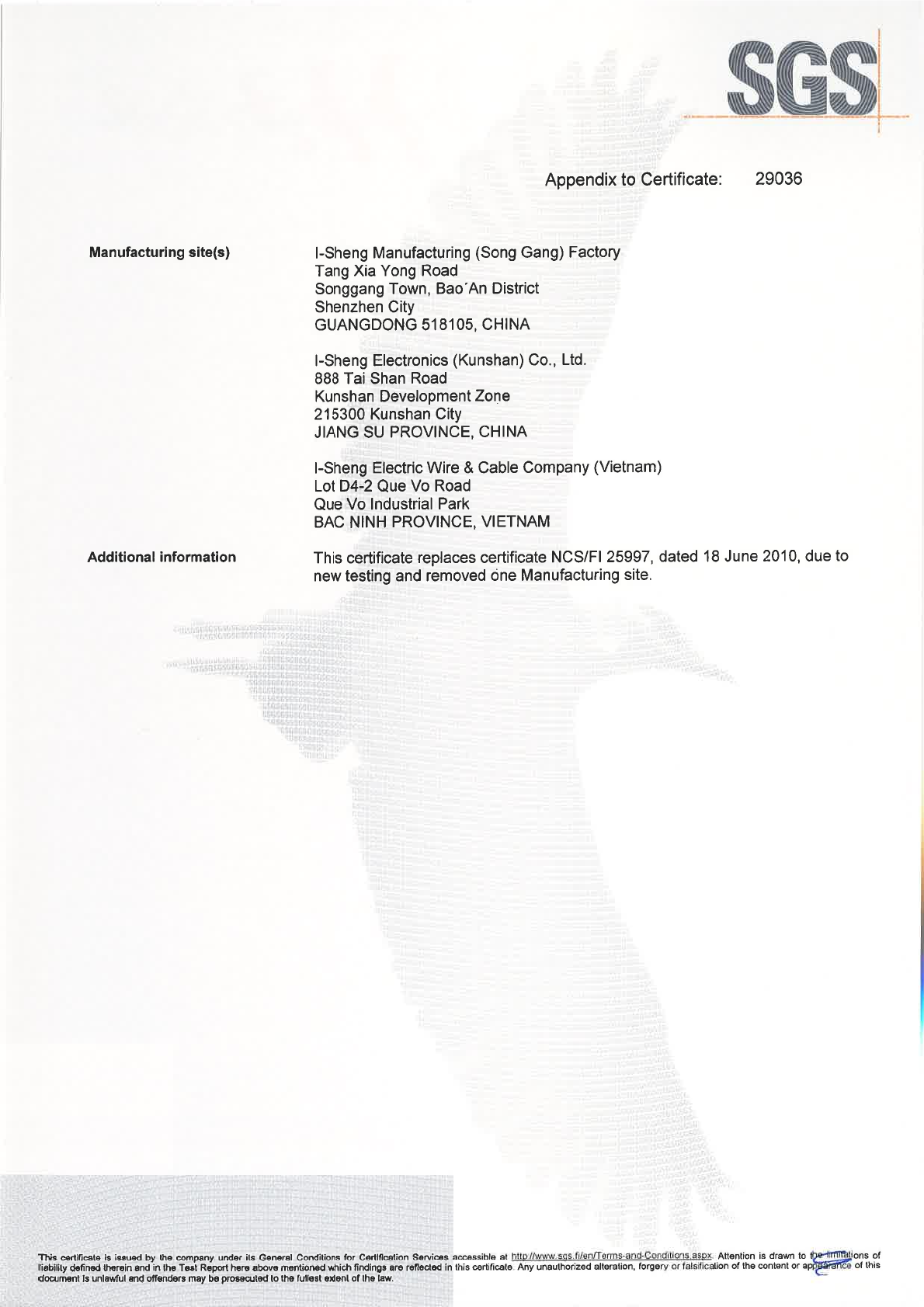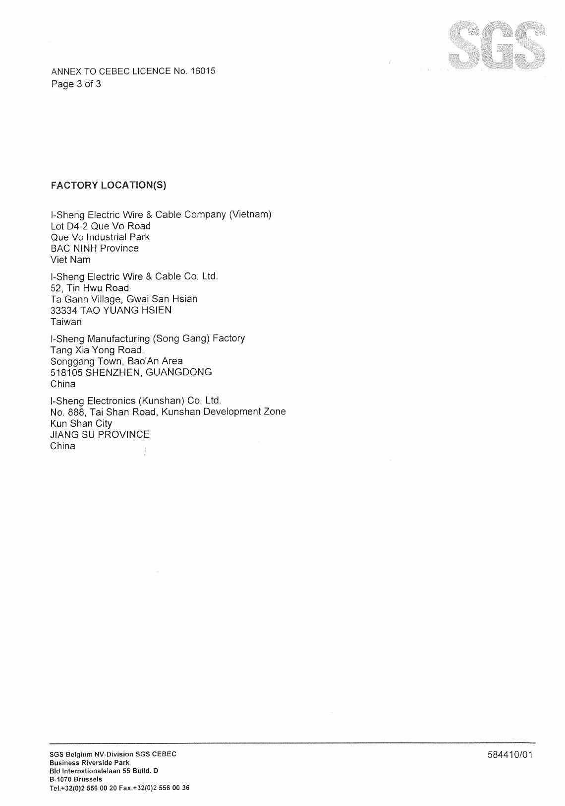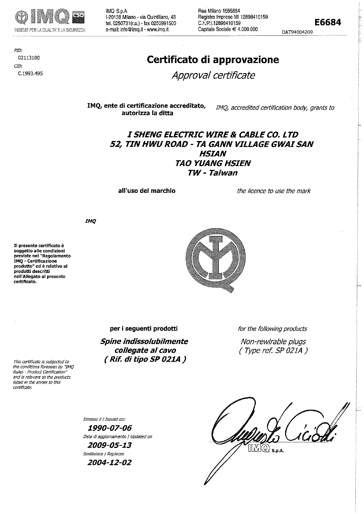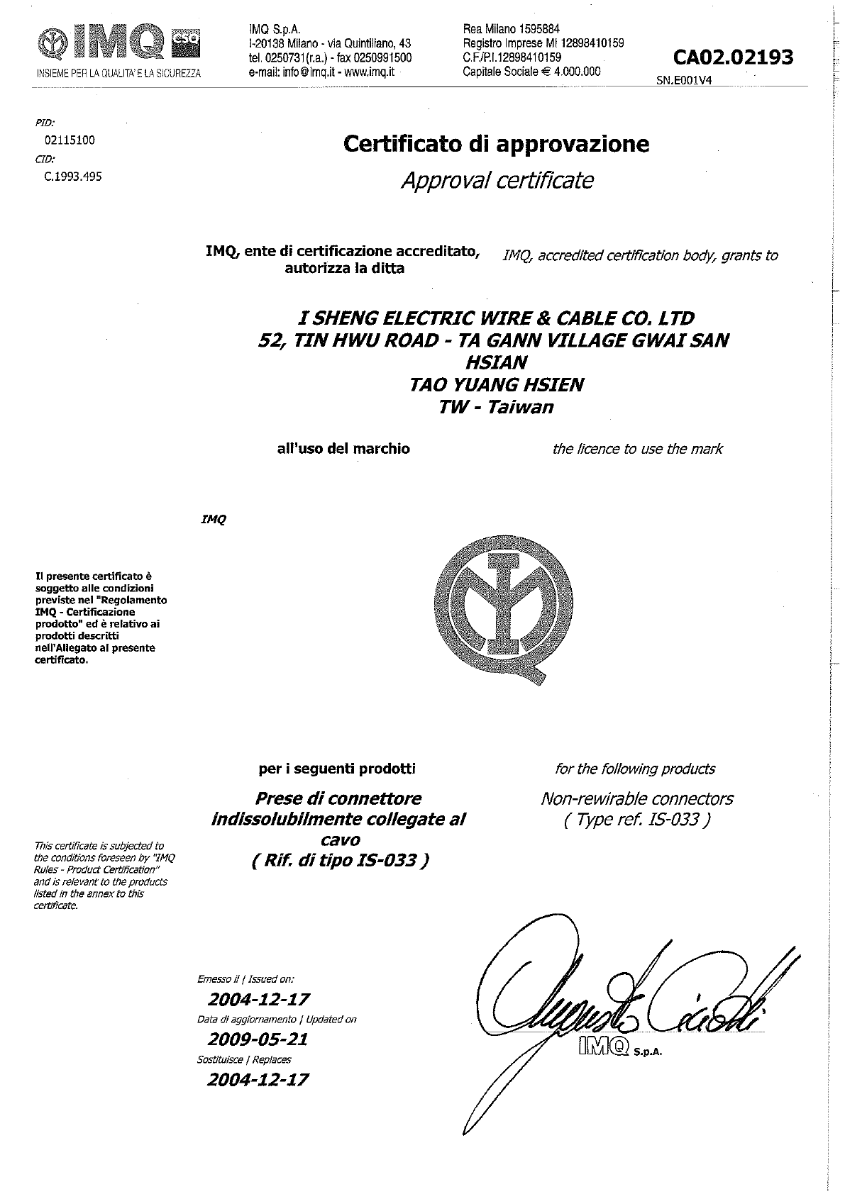 I-Sheng Electric Wire & Cable Co., Ltd., No. 52 Tin Hwu Road, Ta Hua Village, 33334 GWAI SAN,