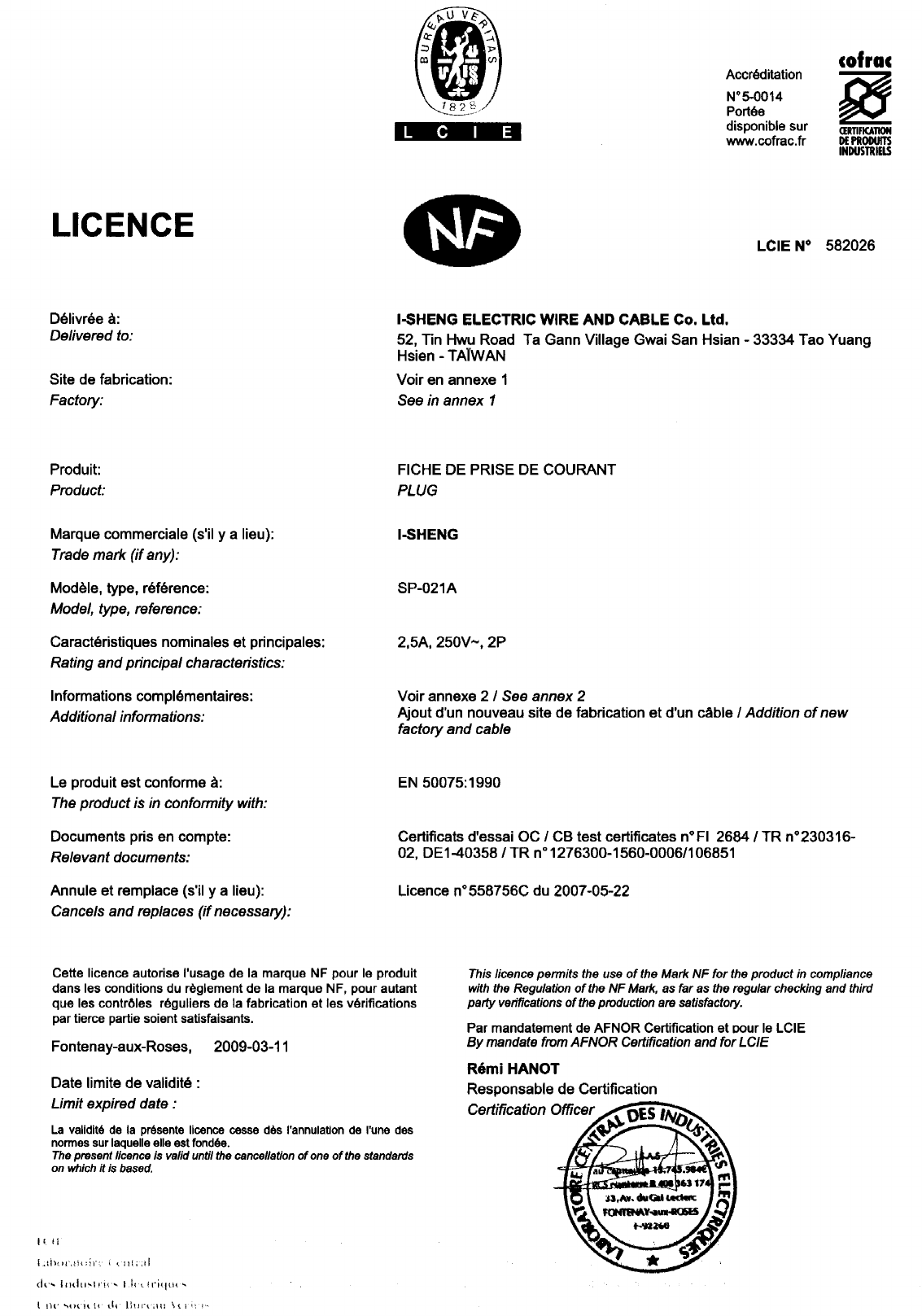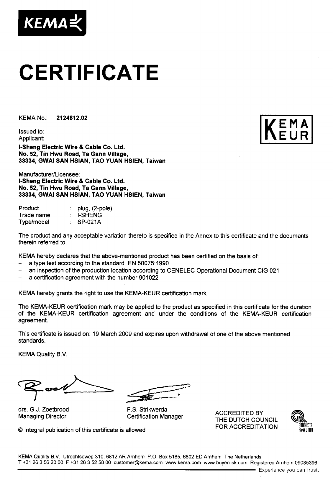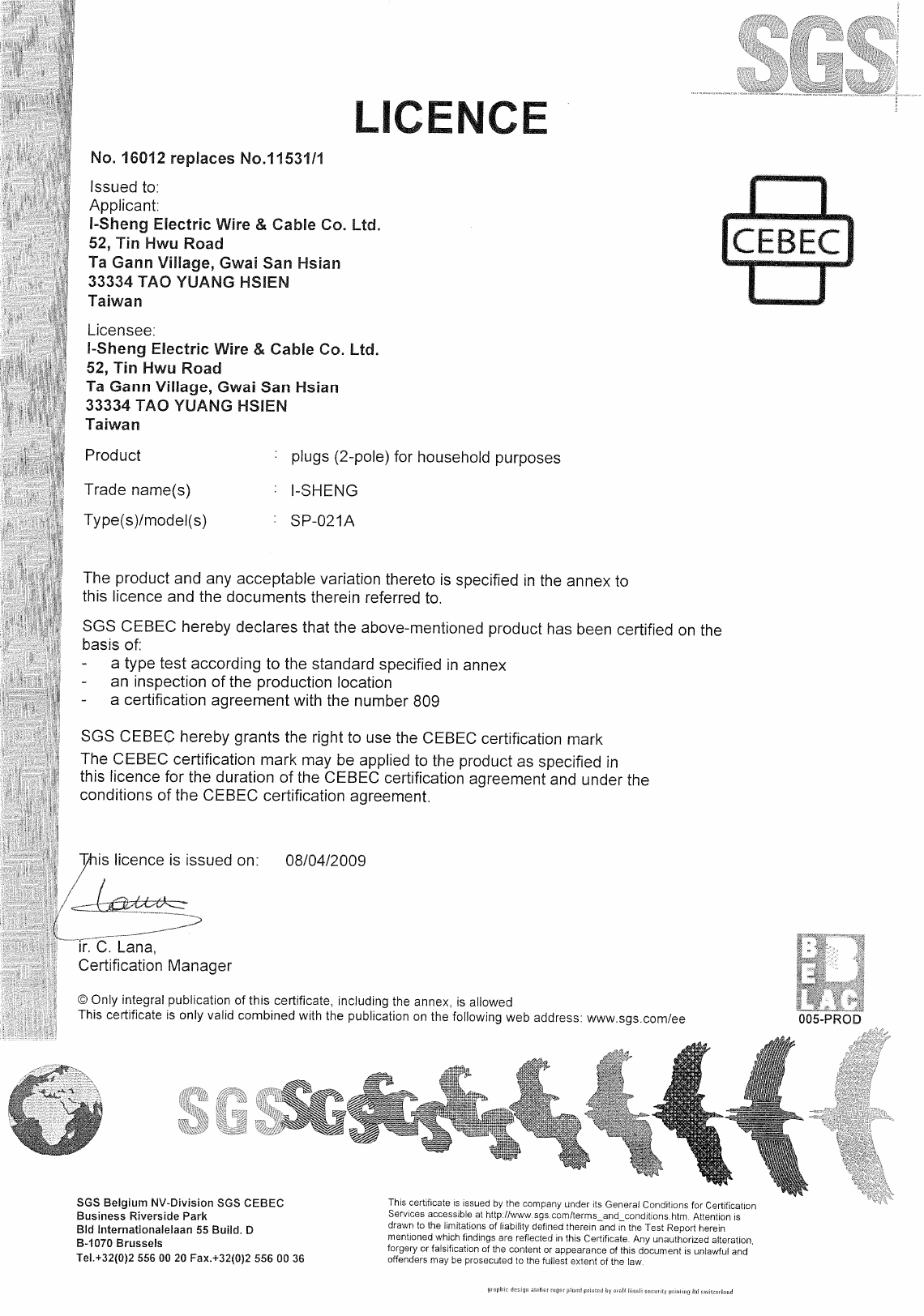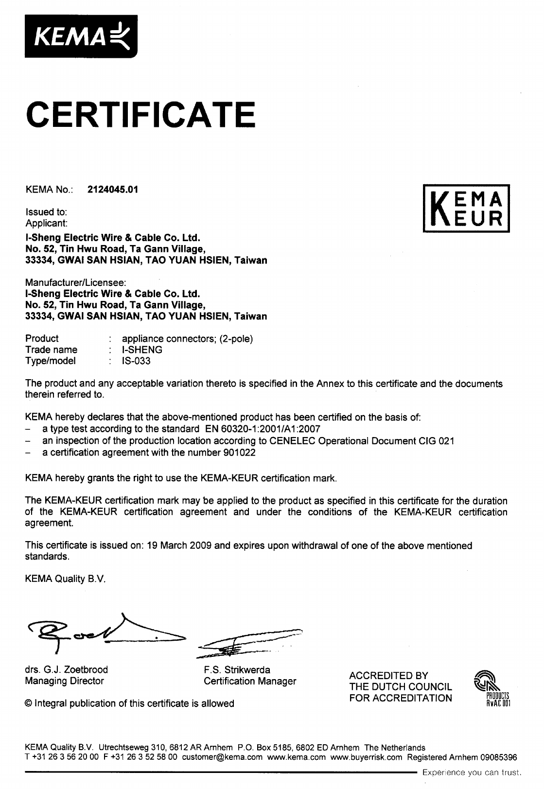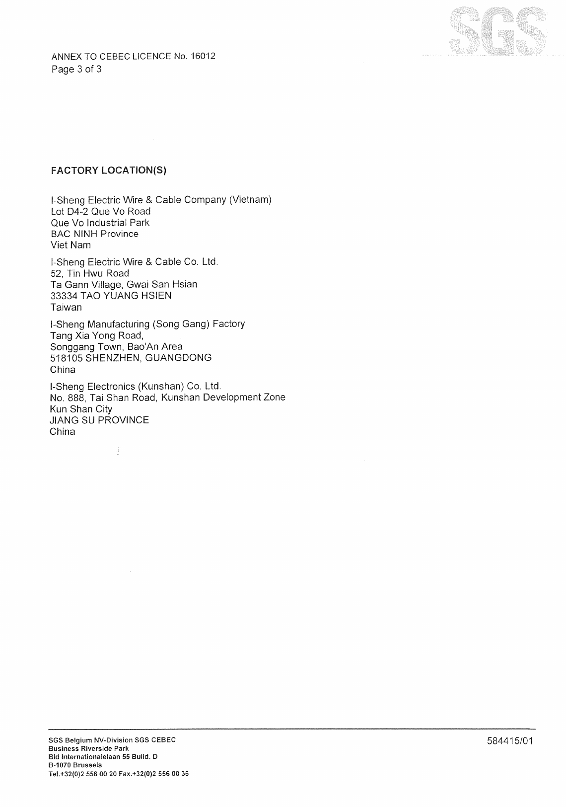 I-Sheng Electric Wire & Cable Co., Ltd., No. 52 Tin Hwu Road, Ta Hua Village, 33334 GWAI SAN,