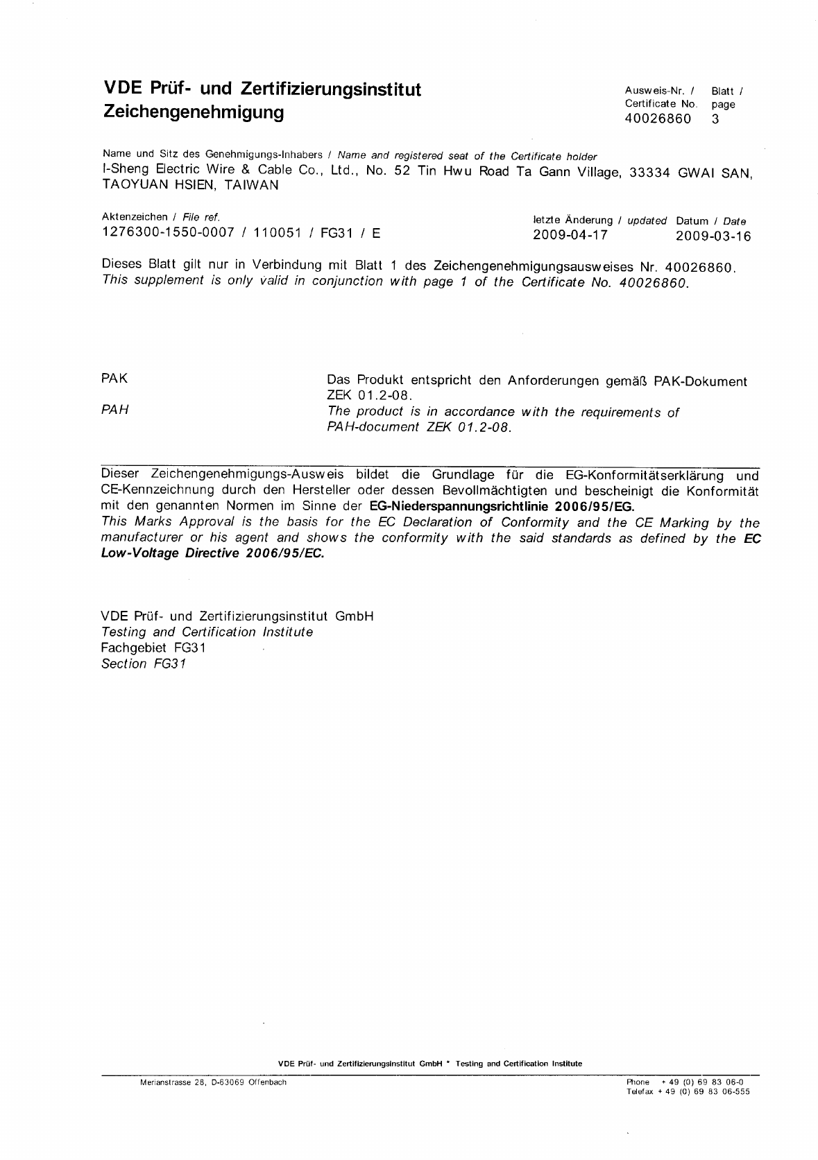 VDE Prüf- und Zertifizierungsinstitut GmbH * Testing and Certification Institute