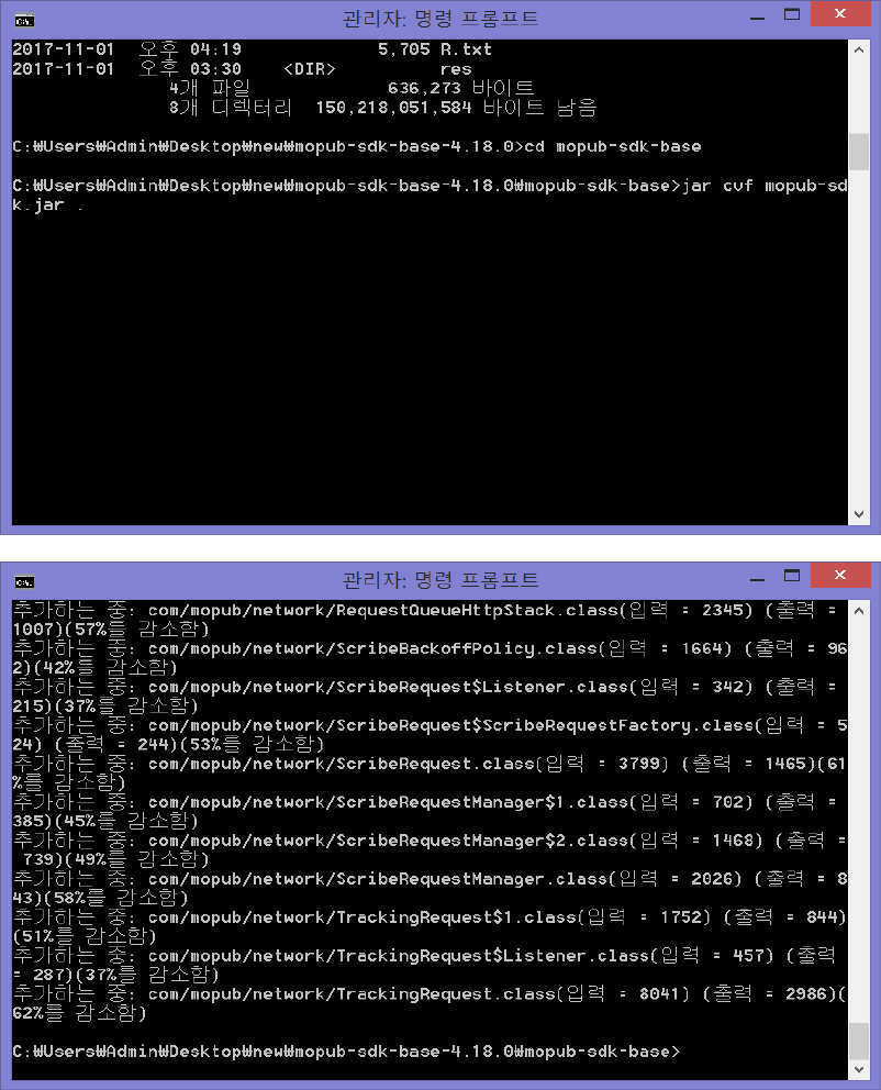 CMD를 이용하여 mopub-sdk-base 폴더로 이동합니다. 그 후 jar 명령을 사용해서 폴더내의 클