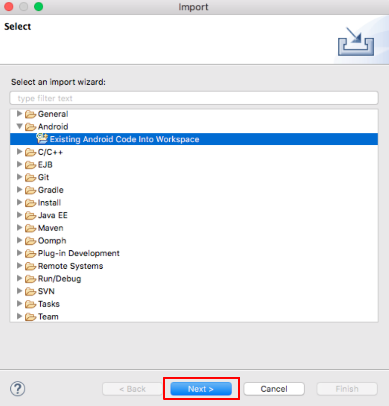 6. Import에서 Existing Android Code Into Workspace 를 선택합니다.
