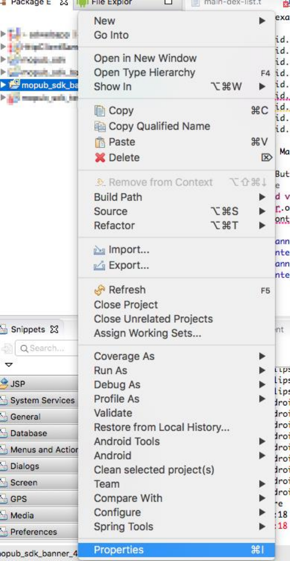 10. MoPub SDK를 적용하고자 하는 프로젝트의 마우스 오른쪽 버튼을 클릭하여 Properties를 선