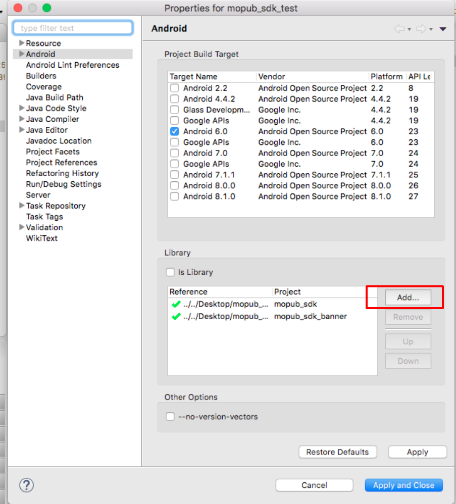 택합니다. 그 후 Android 탭의 Library에서 Add를 클릭합니다.
