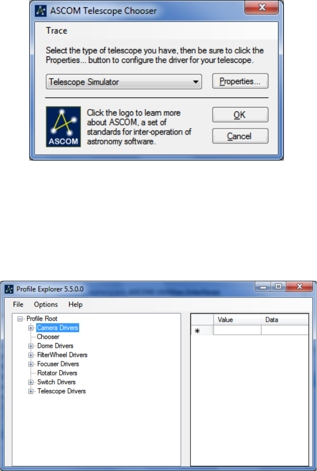 The Profile Explorer allows viewing of the ASCOM Profile. The ASCOM