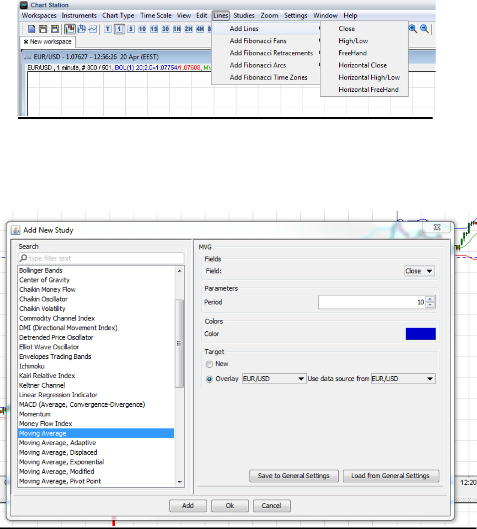 Lines and Studies menu allows the Client to add necessary trendlines, Fibonacci retracements and