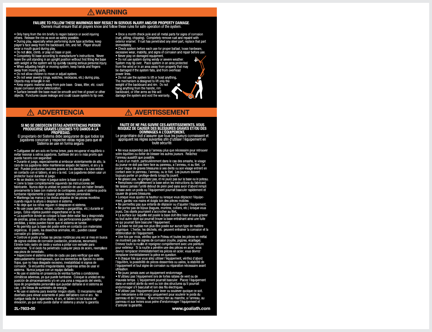 888-USA-GOAL / Warranty Dept. Or Write Escalade Sports at: Escalade Sports - P.O. Box 889, Evansville,