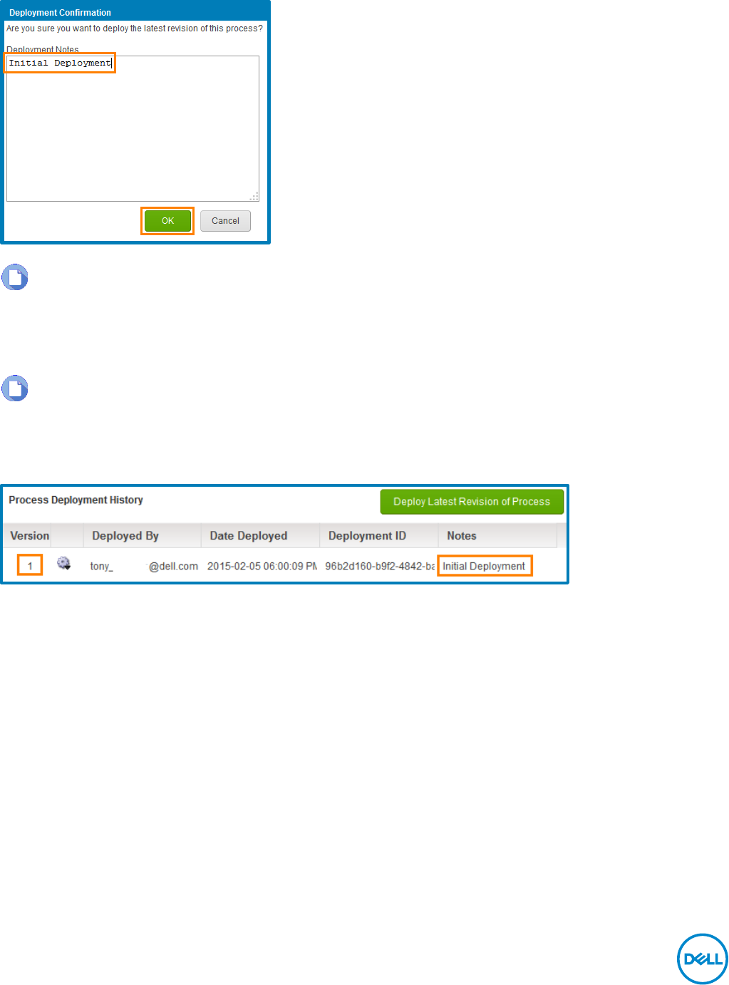 In the Deployment Confirmation pop-up, for the Deployment Notes enter Initial Deployment,