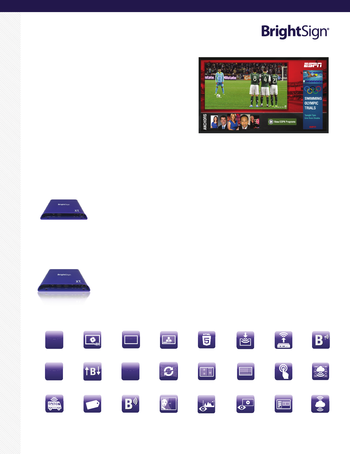 Includes all the features BrightSign XT243, plus serial, dual USB (type A and C) and Live TV playback via the