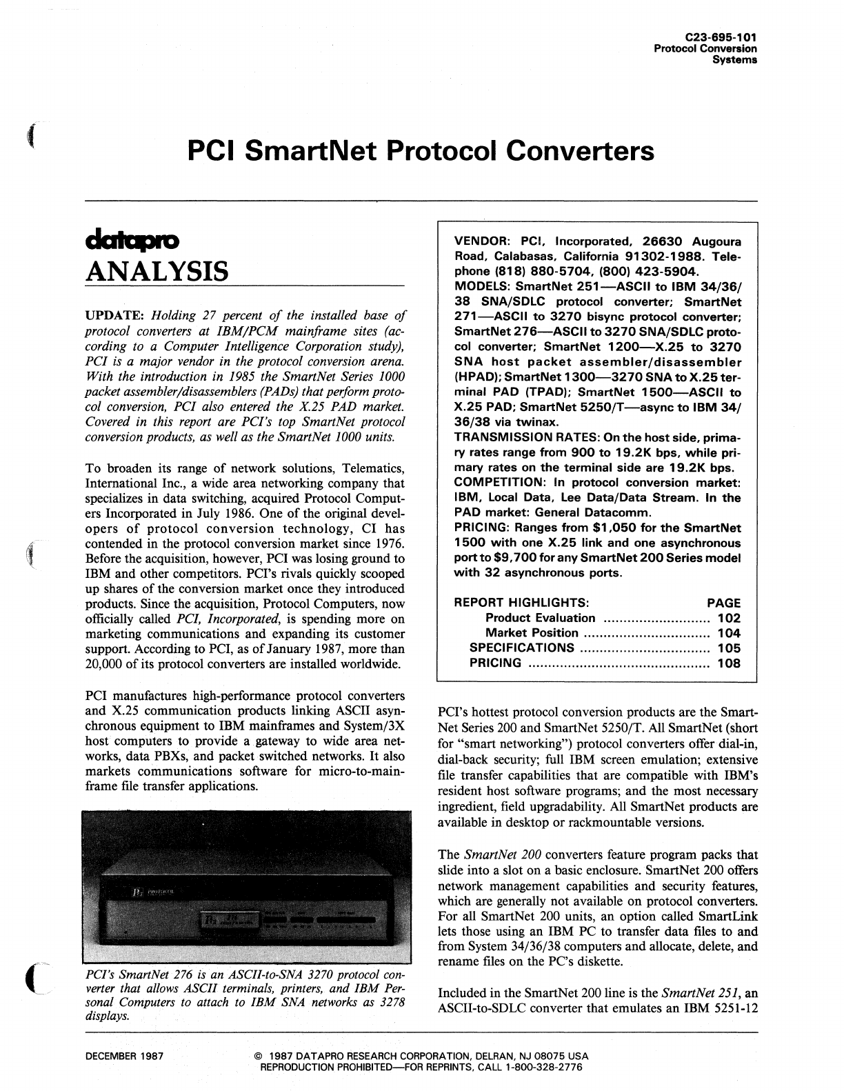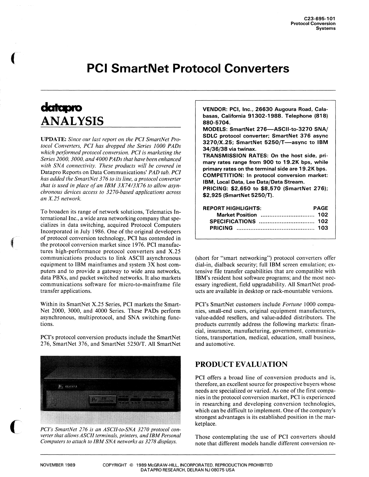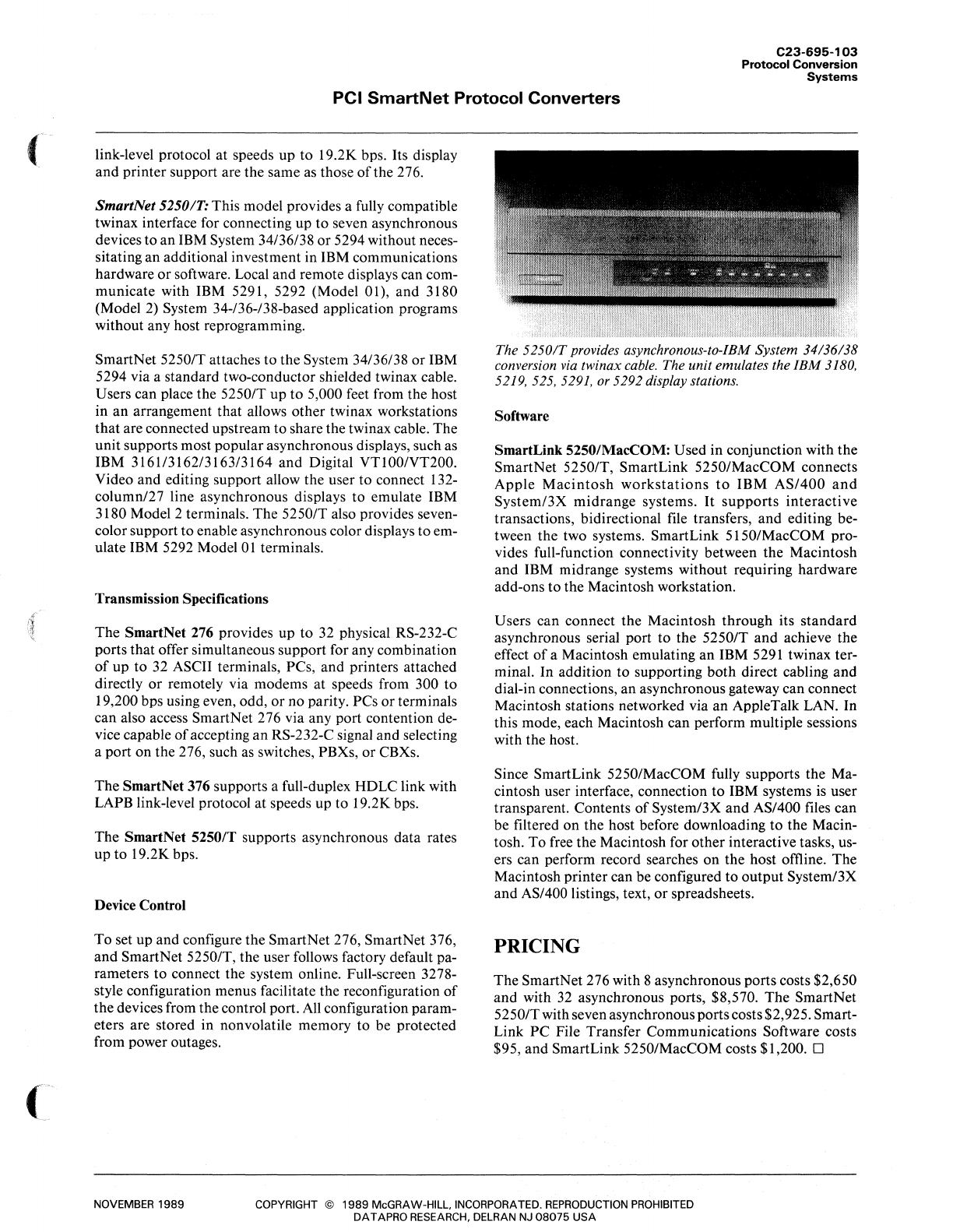 PC/'s SmartNet 276 is an ASCII-to-SNA 3270 protocol con-