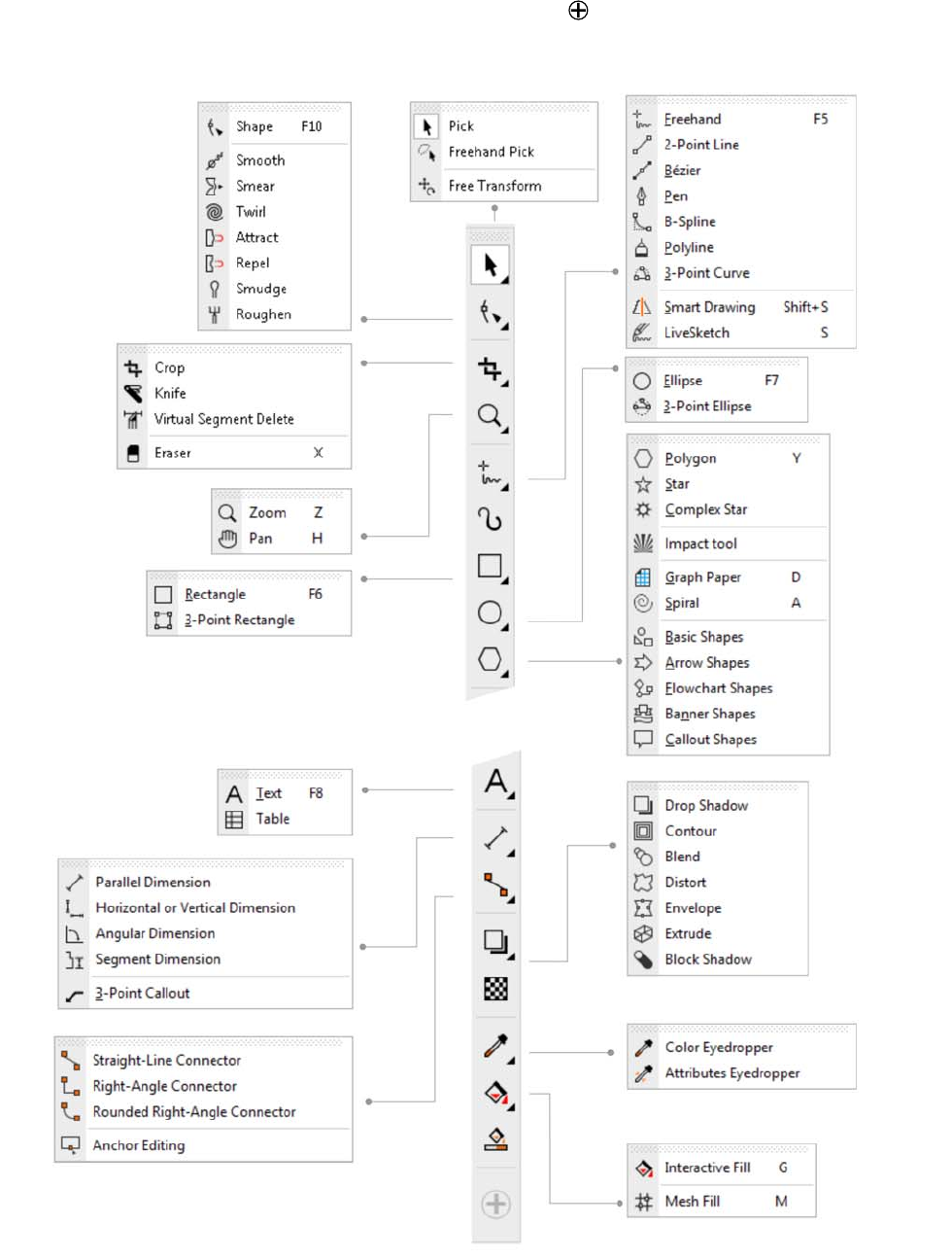 Many of the tools in the CorelDRAW toolbox are organized in flyouts. To access such tools, click the small arrow in the lower-right corner