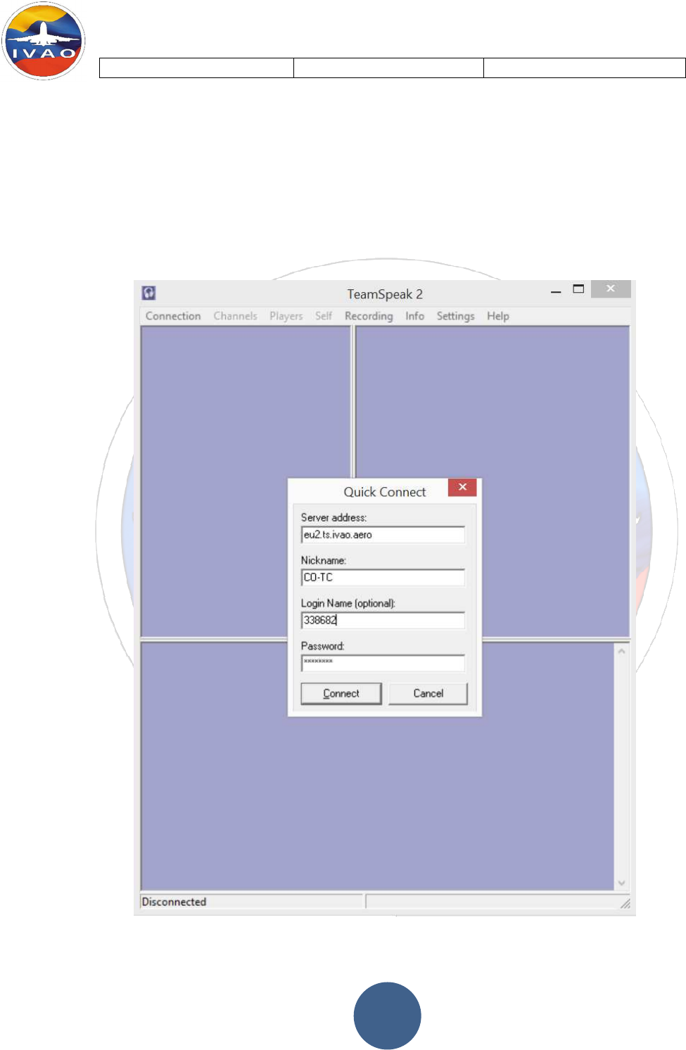 -Server Address: Servidor de Teamspeak de IVAO. Ejemplo eu2.ts.ivao.aero
