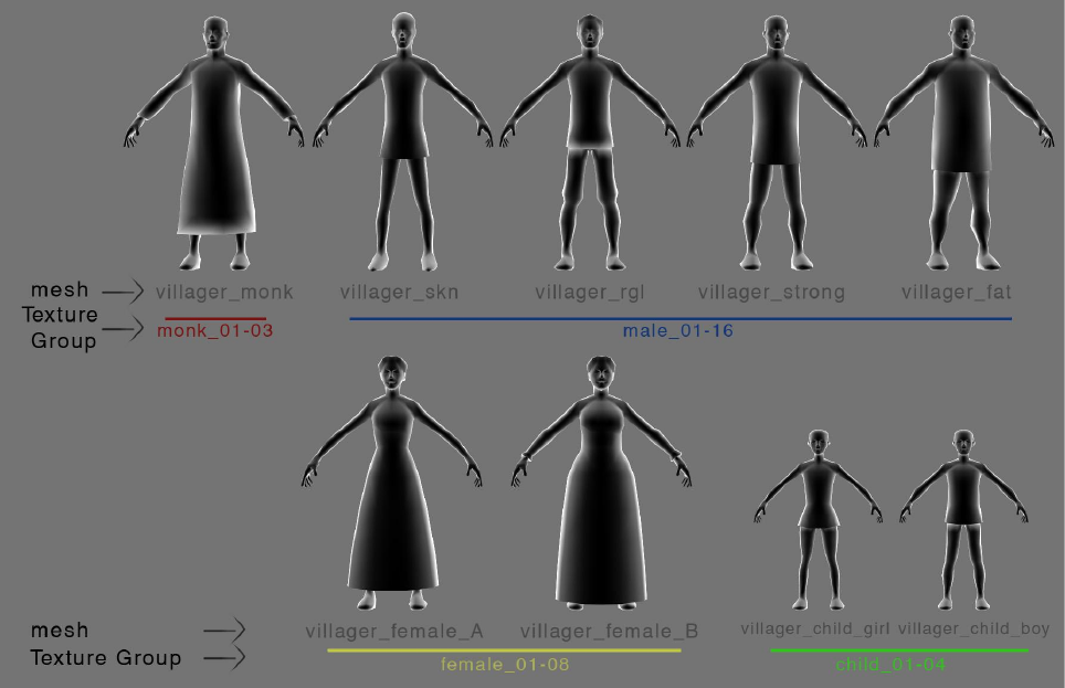 There are 4 types of characters. Each type uses its own set of texture.