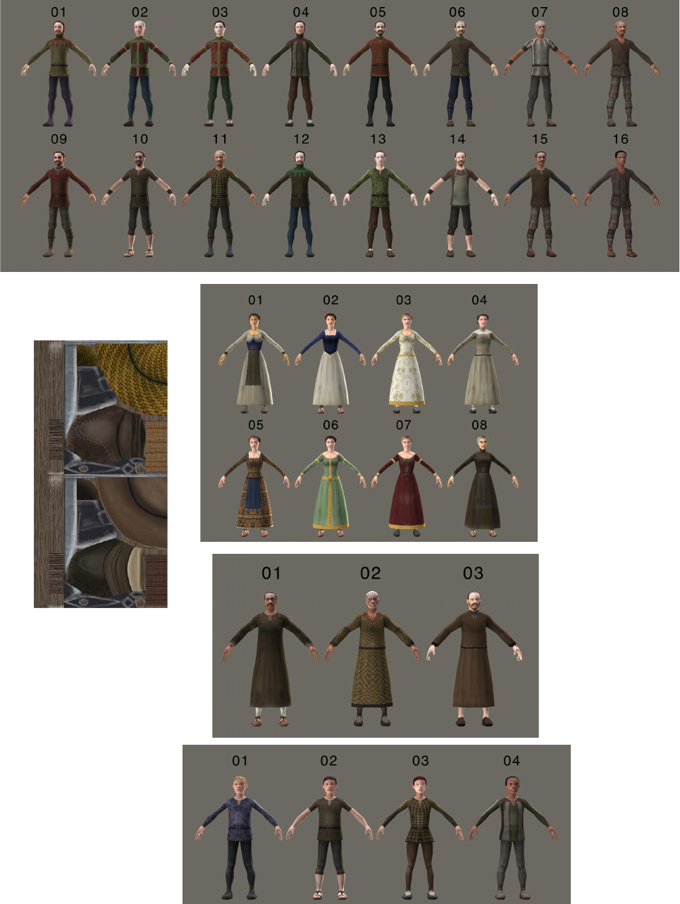 There are 16 male, 3 monk, 8 female, 4 child and 2 equipment textures.
