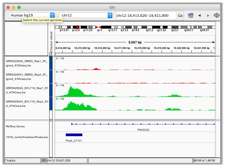 To visualize ATAC-seq signals from the control and treatment samples, select a