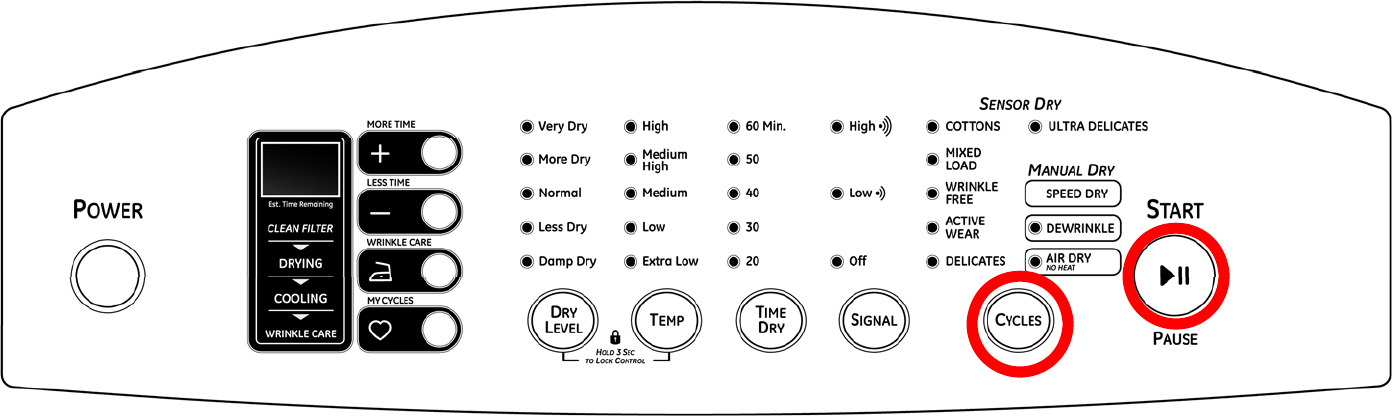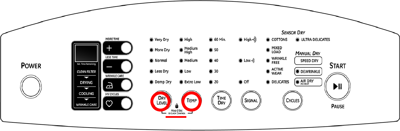 •Press Dry level and Temp for 3 seconds
