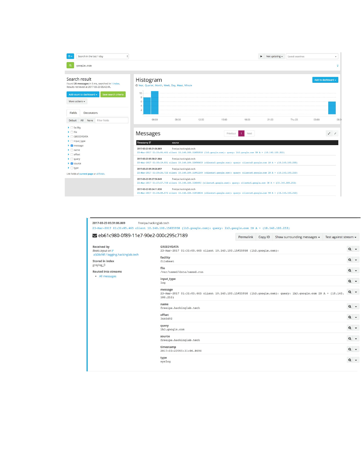 ● Let’s search for every log entry where the key is and the values google.com