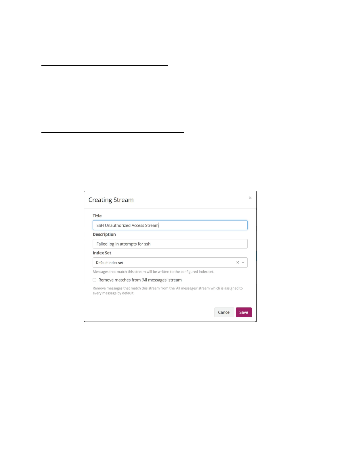 a. Enter “SSH Unauthorized Access Stream” for title