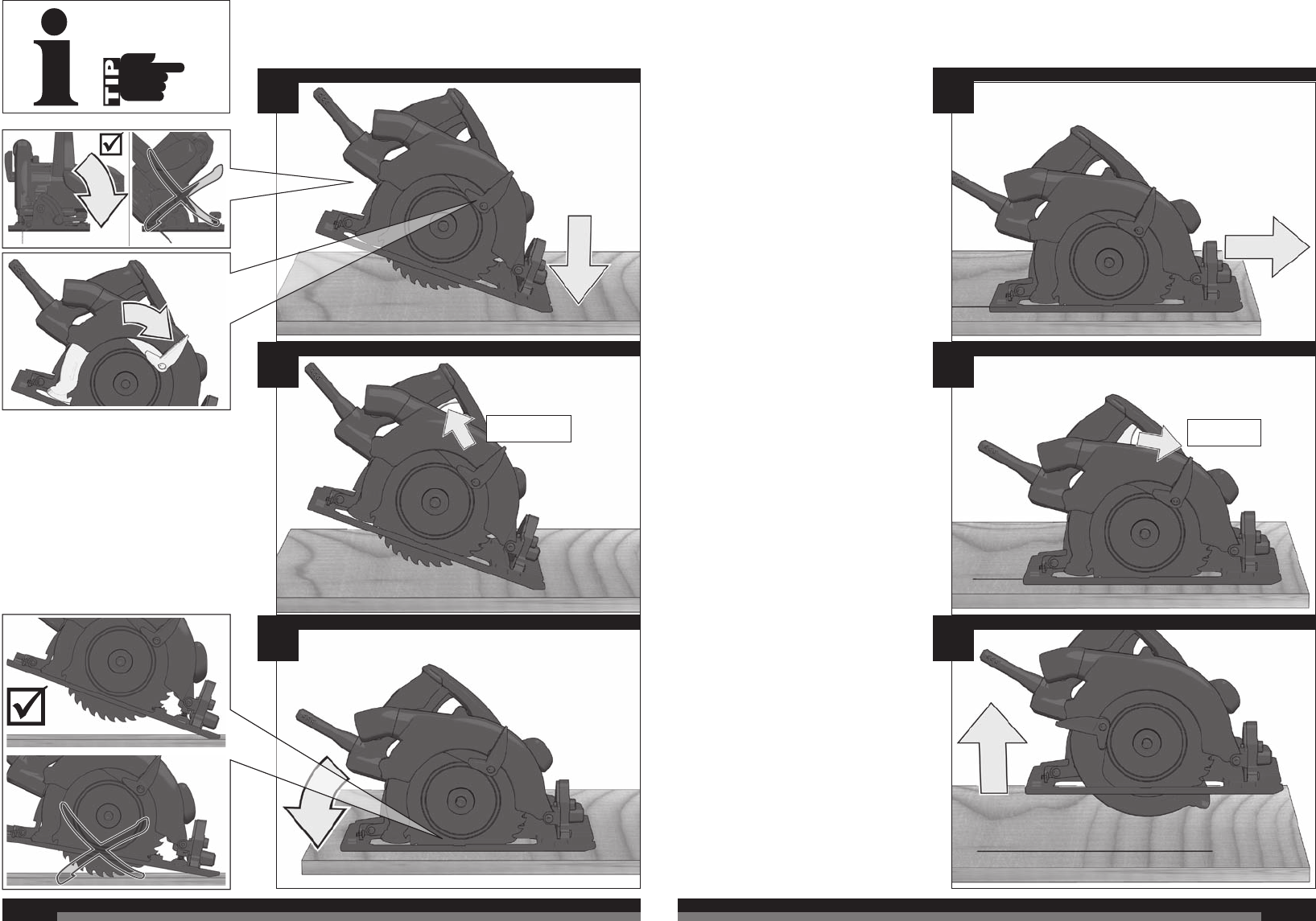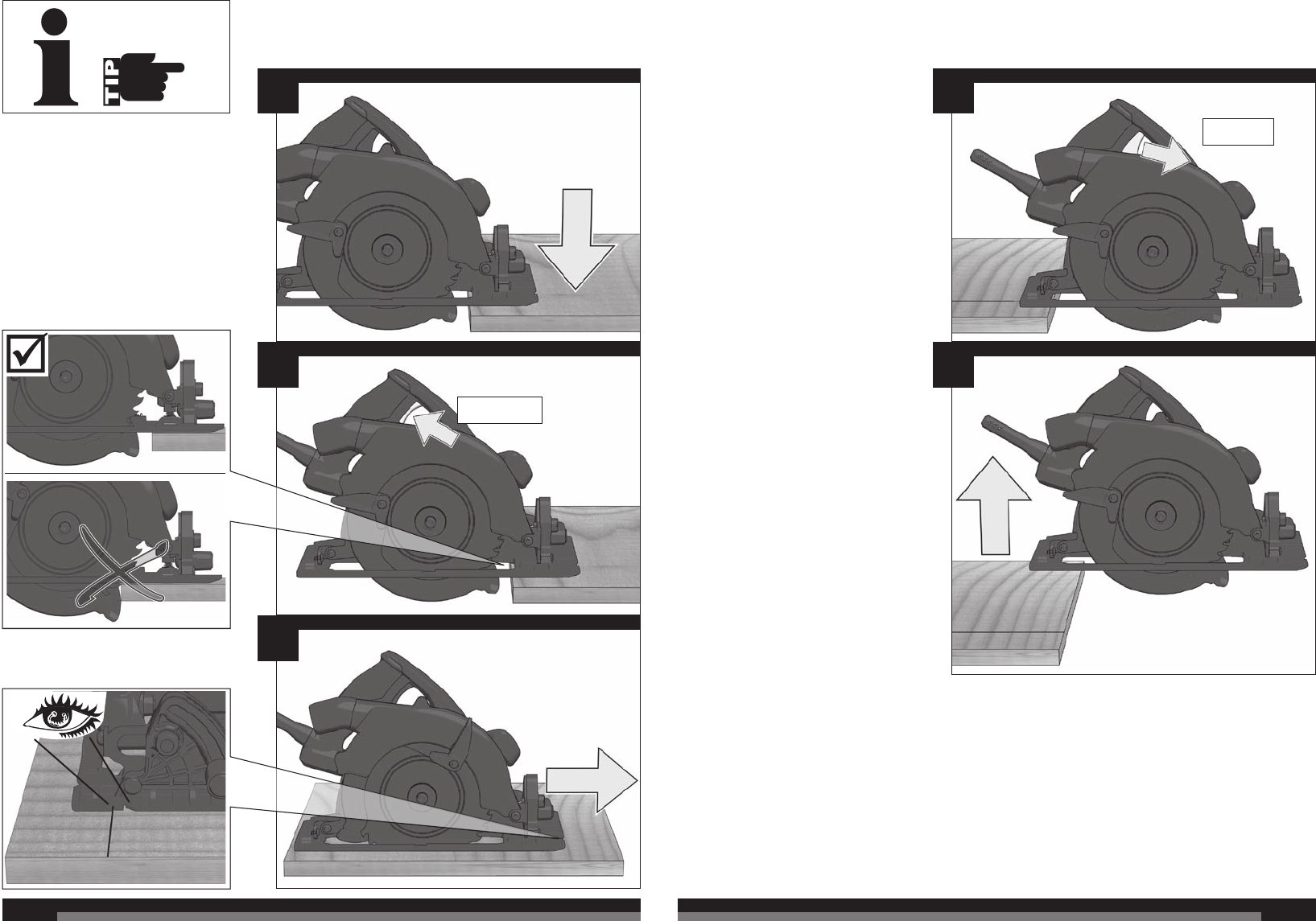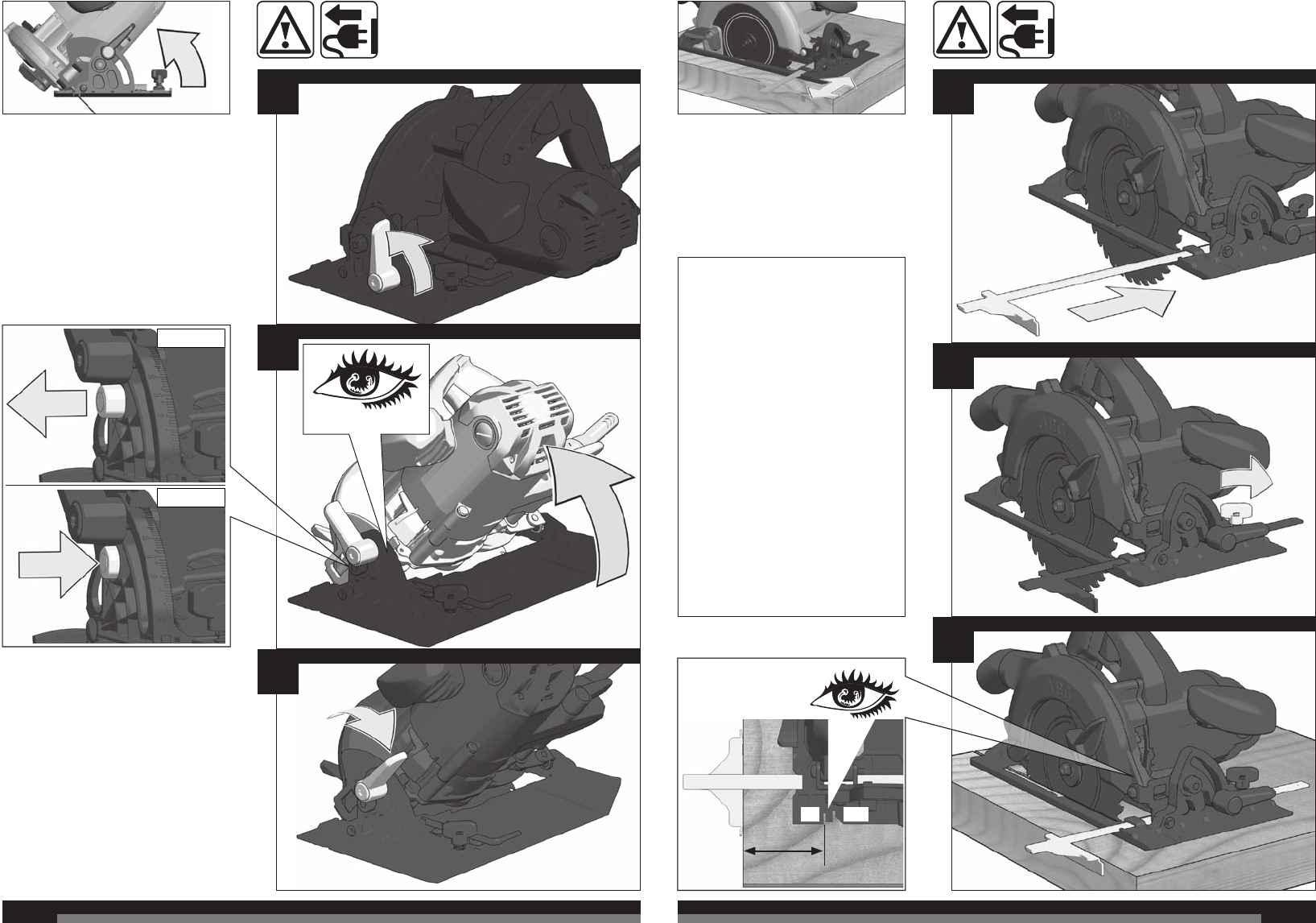 重 新 开 动 插 在 工 件 中 的 圆 锯 时 , 必 须 先 把 锯 片 放