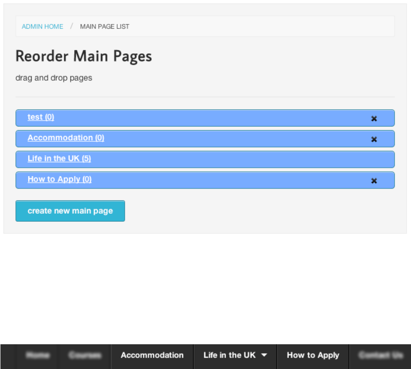 To re-arrange the order of existing Main Pages, move your curser over the blue bar