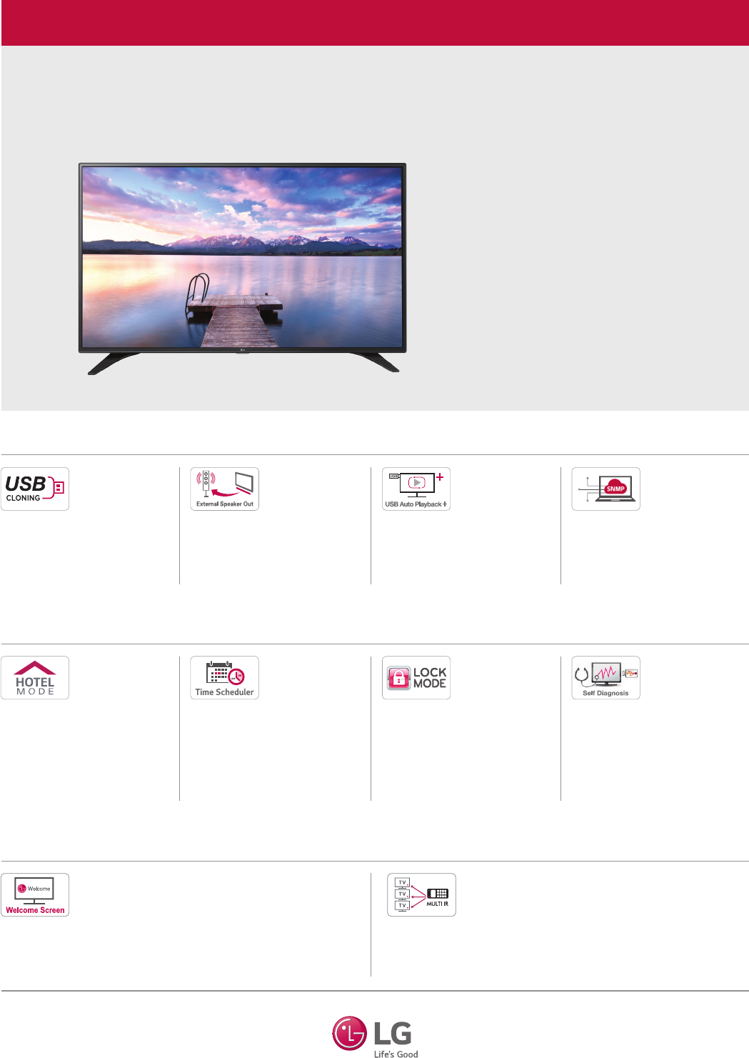 COMMERCIAL FEATURES Welcome Screen/Video, Lock Mode, Hotel Mode, Multi-IR Code, USB Cloning, External Speaker Out,