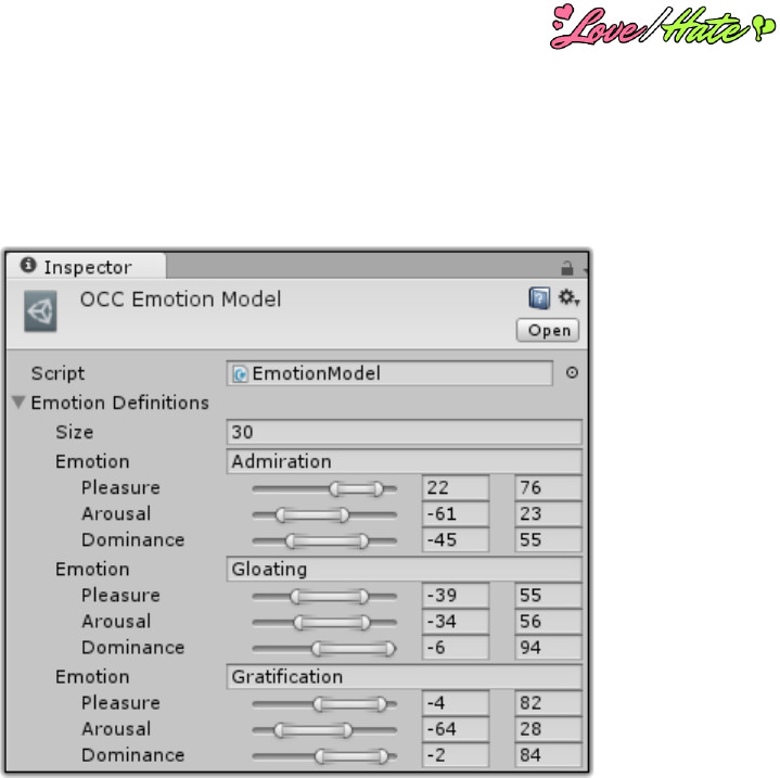 Love/Hate ships with OCC Emotion Model, an emotion model template that maps the 22 OCC