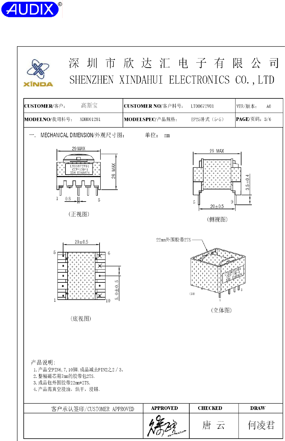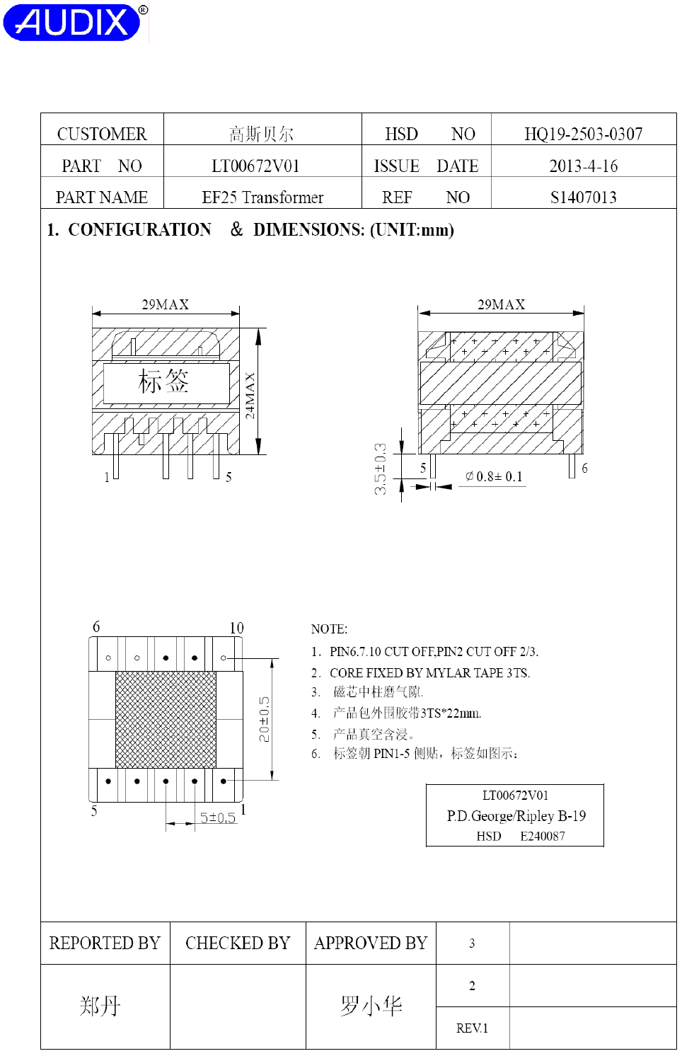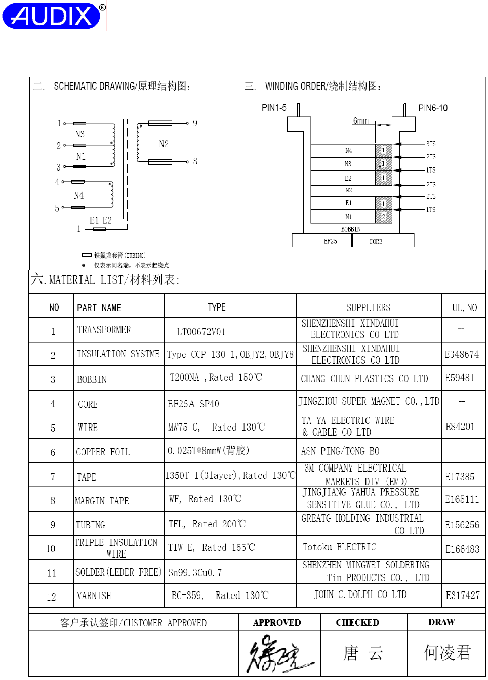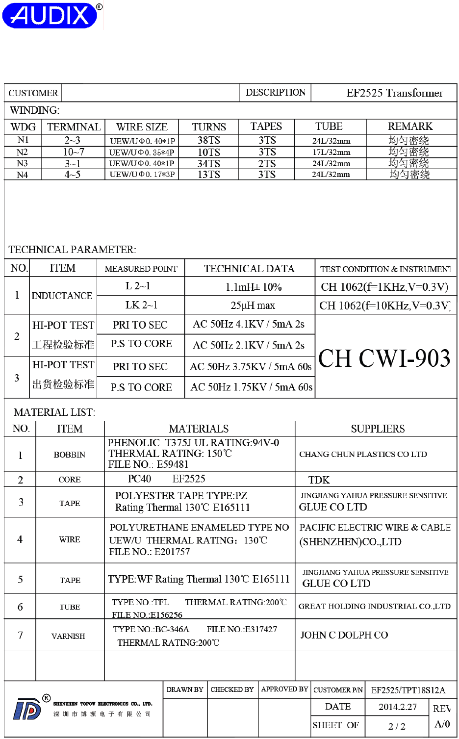 Attachment C: Transformer T1 Specification for TPT18S12A (model: EF2525) Page 6 of 6