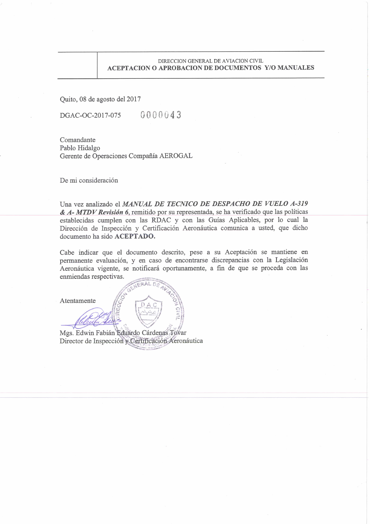 El Manual Técnico de Despacho de Vuelo y sus partes son aprobados por la Dirección General de Aviación