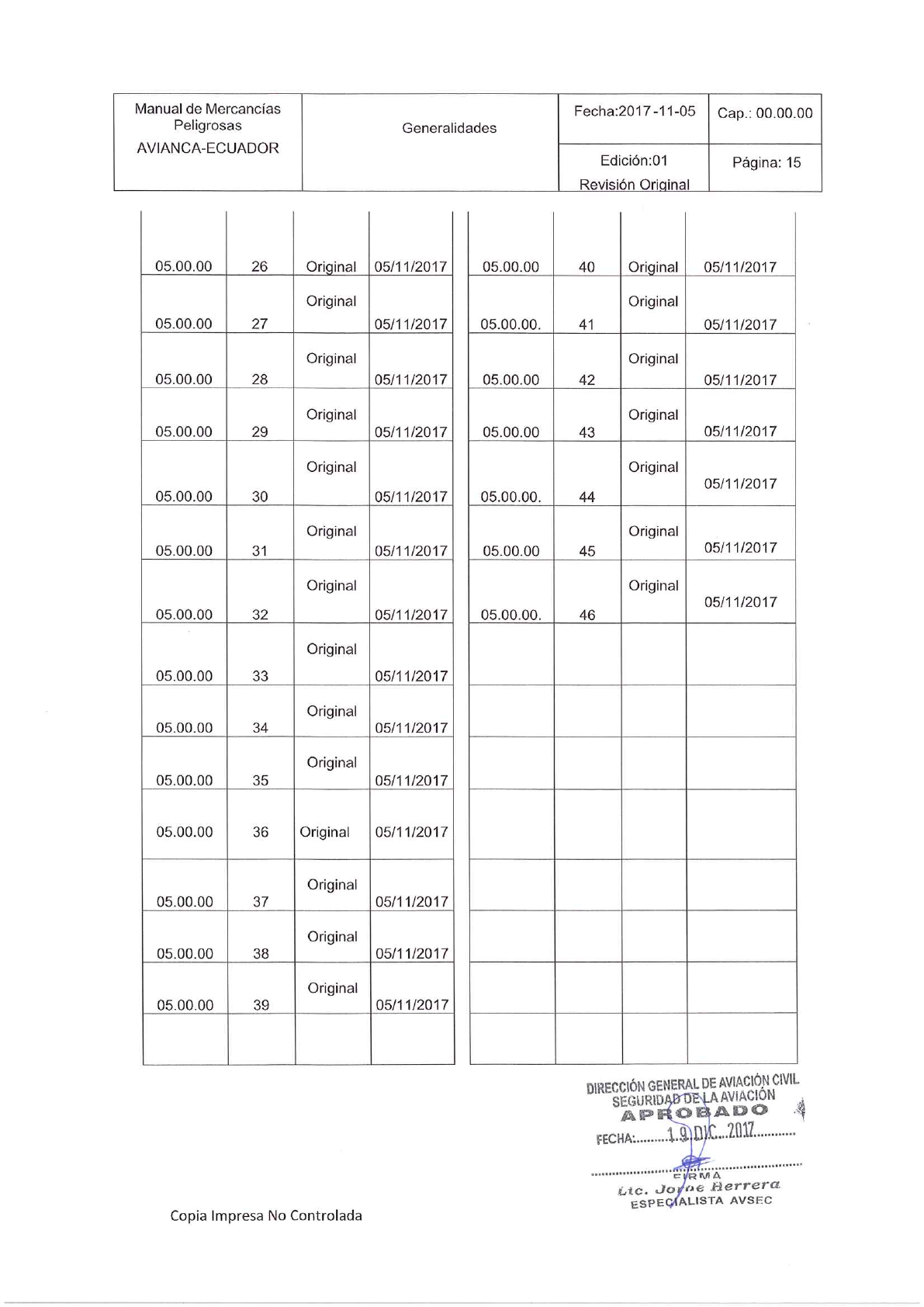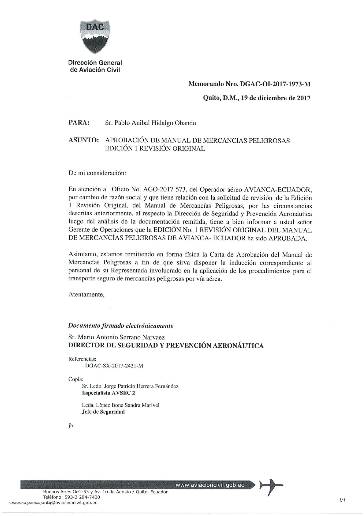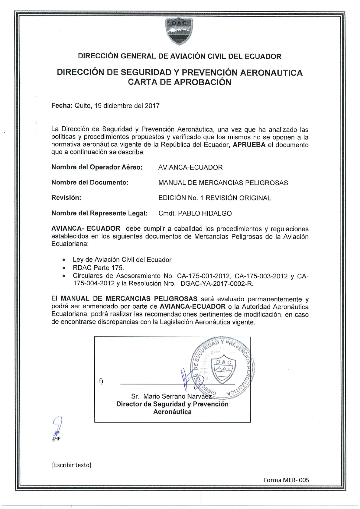 Gerencia de Mercancias Peligrosas para ser aprobado nuevamente.