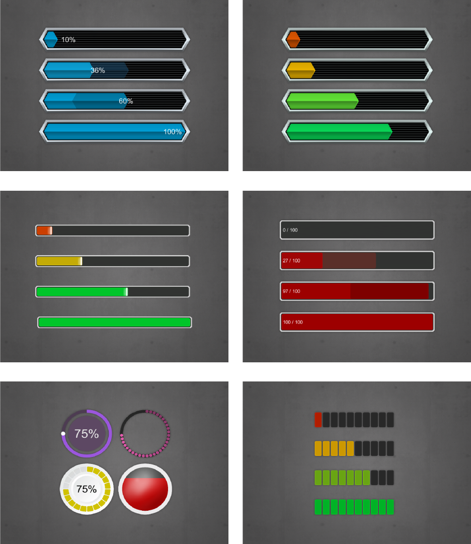 fillable linear or circular bars. These can be used as progress meters, health or energy bars
