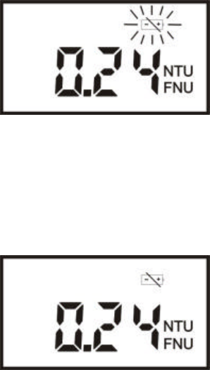 There are two battery warning levels. A flashing battery icon on the display indicates that