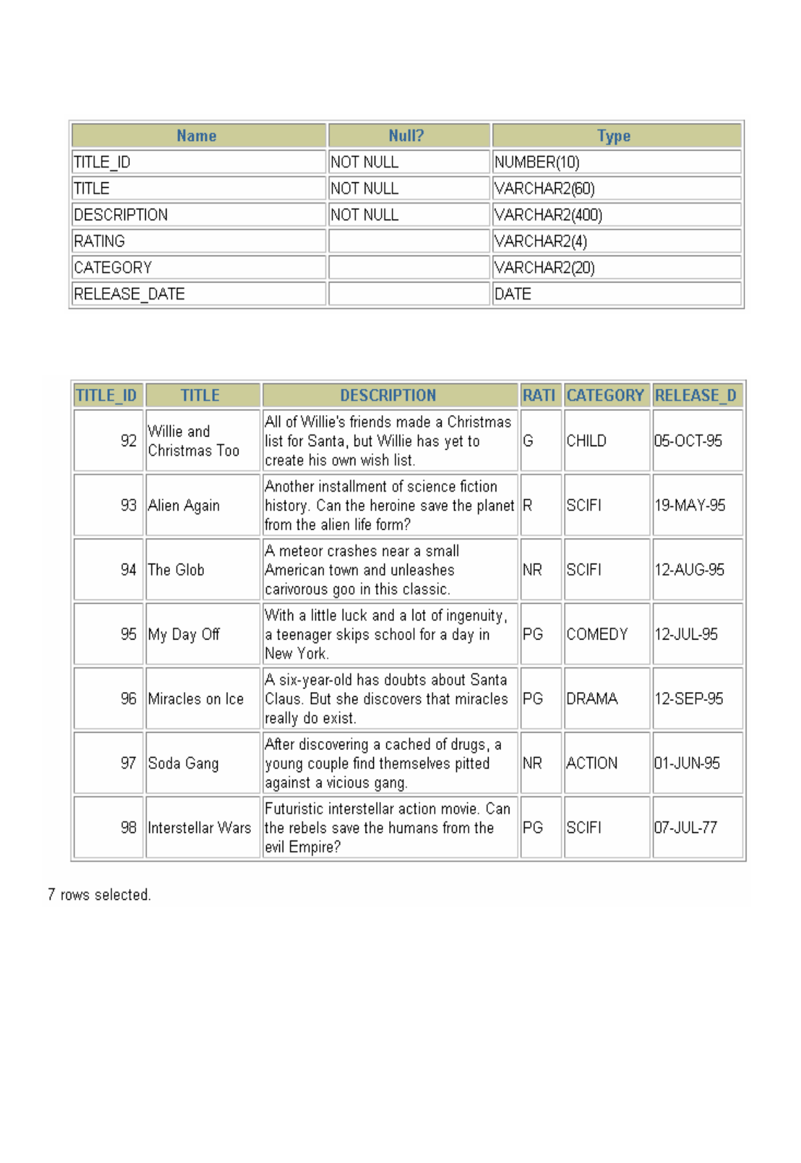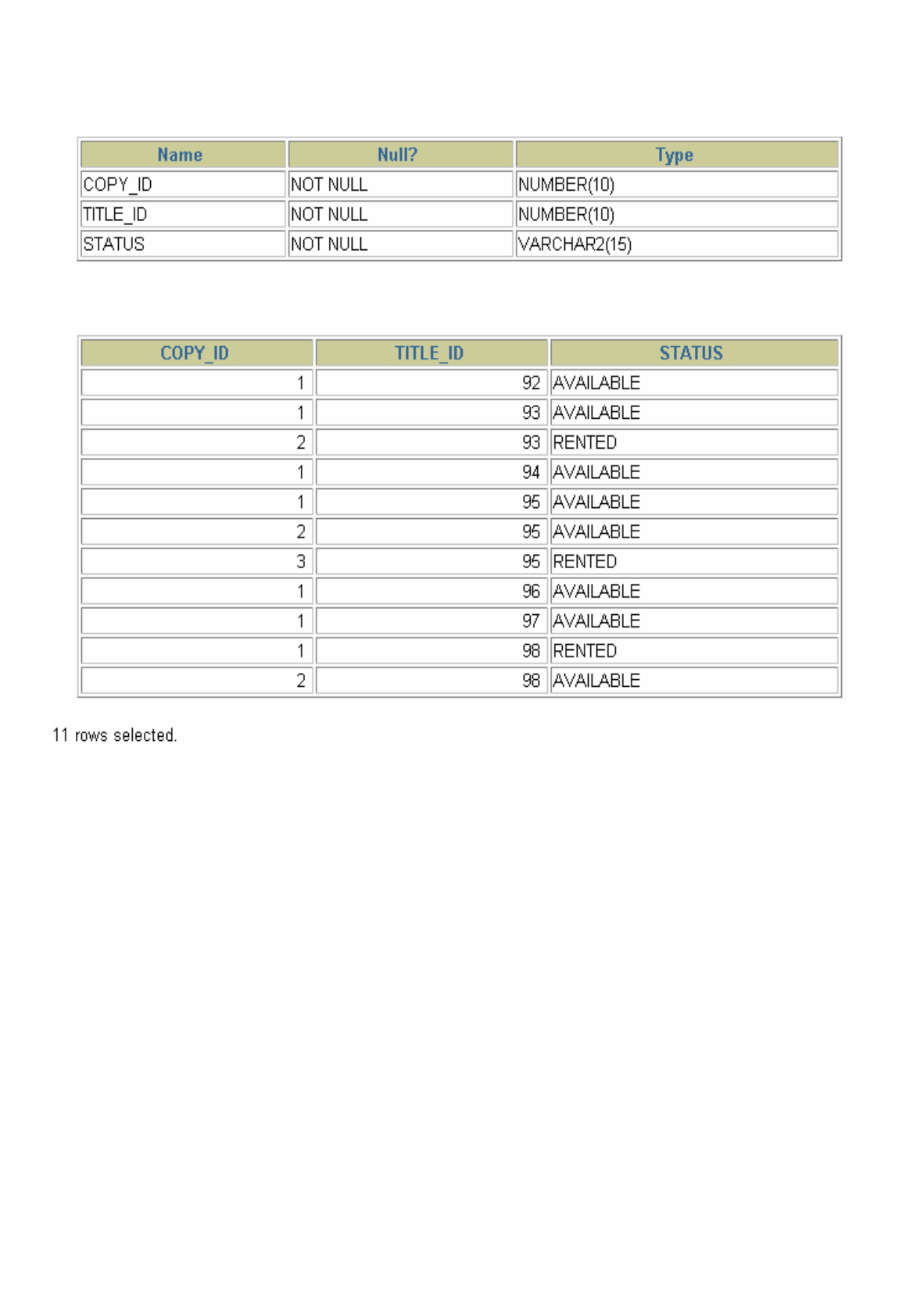 The video store database contains the following tables: TITLE, TITLE_COPY, RENTAL,