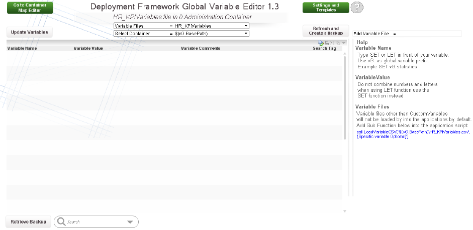 Framework. Each Container has its own Custom Global Variable file that the applications use. For Global