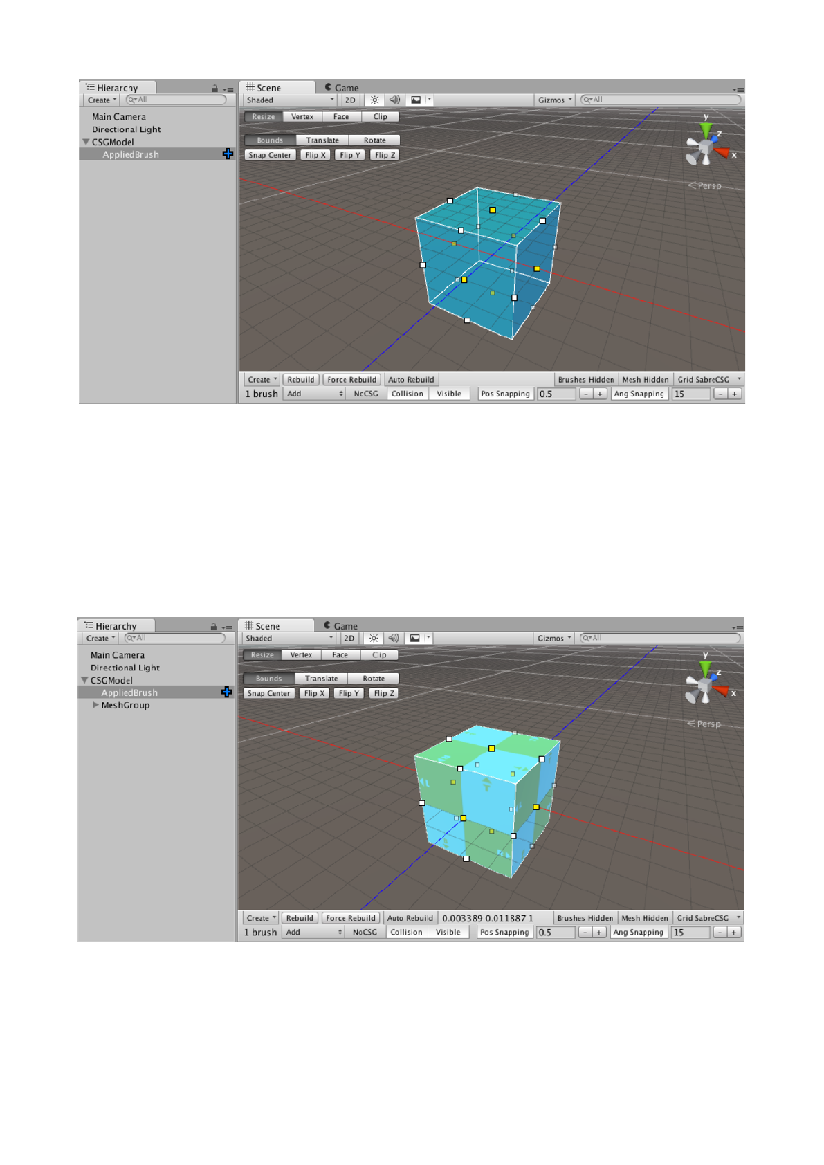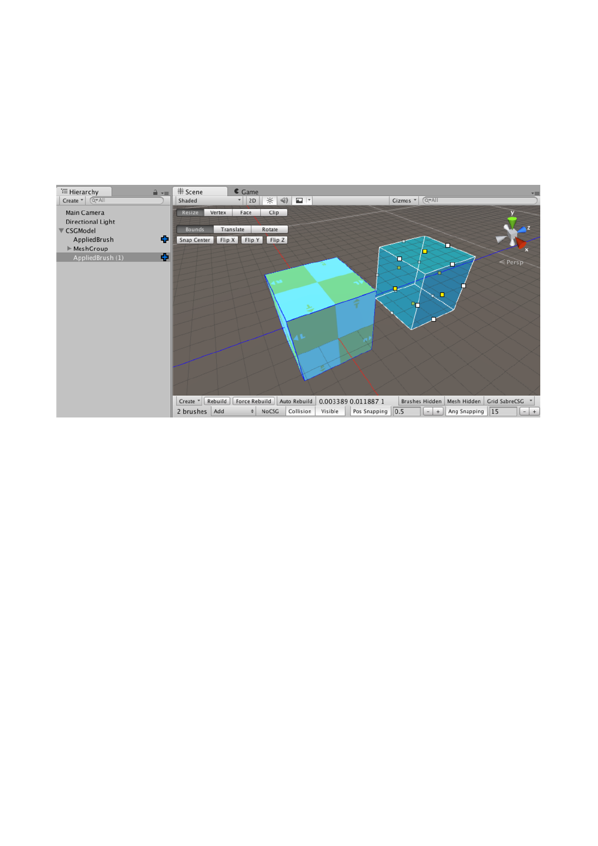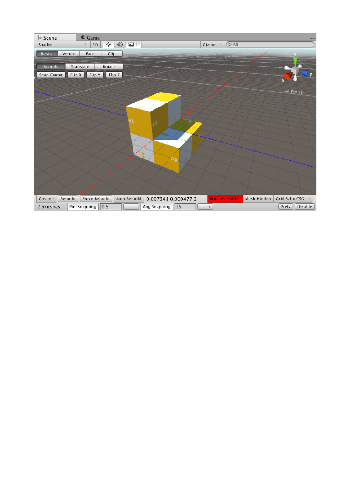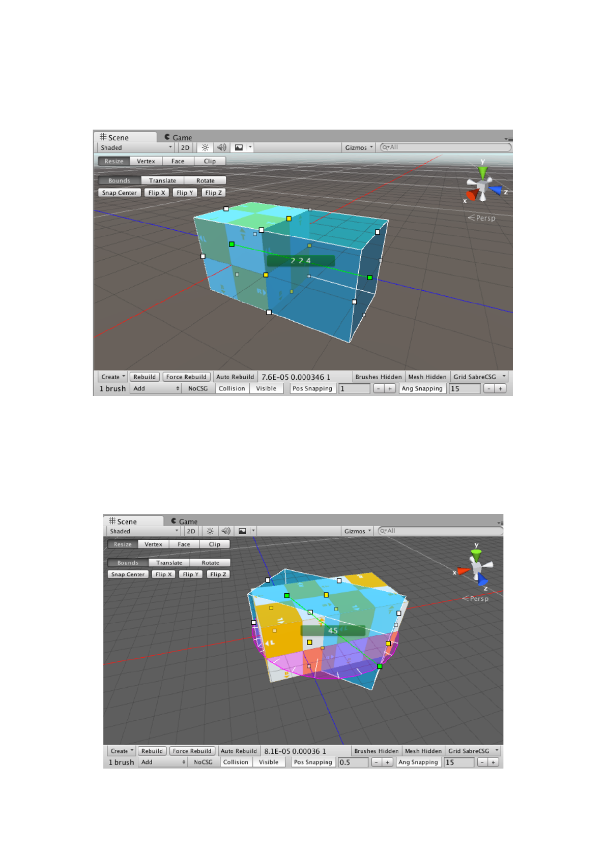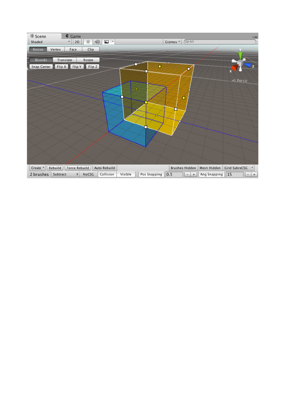 using SabreCSG’s Resize, Clip, or Vertex tools, additive brushes are blue and subtractive brushes