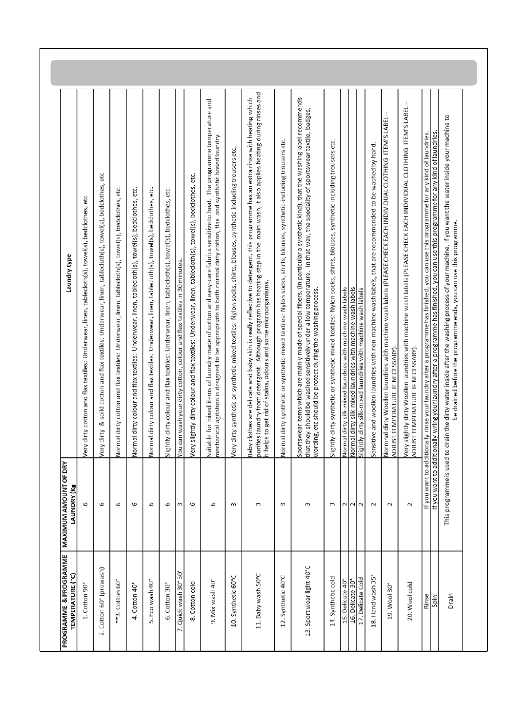 dirtiness of your laundry. (see programme table)