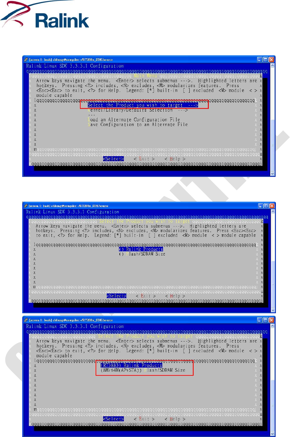 YoumustswitchdirectorytoRT2888x_SDK/sourceandexecute“makemenuconfig,”likebelow: