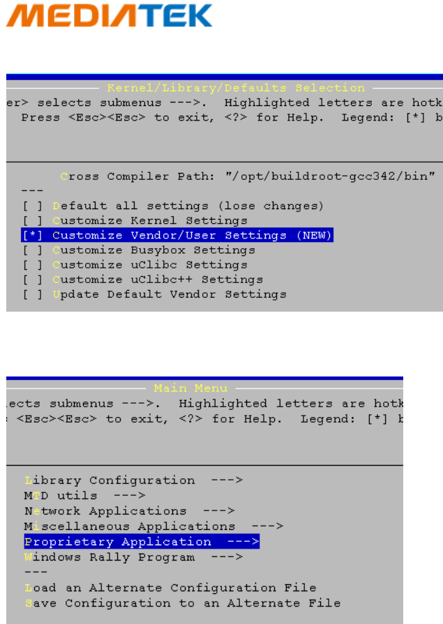 1. Under source directory, type “make menuconfig” and Enter “Kernel/Library/Defaults Selection” to