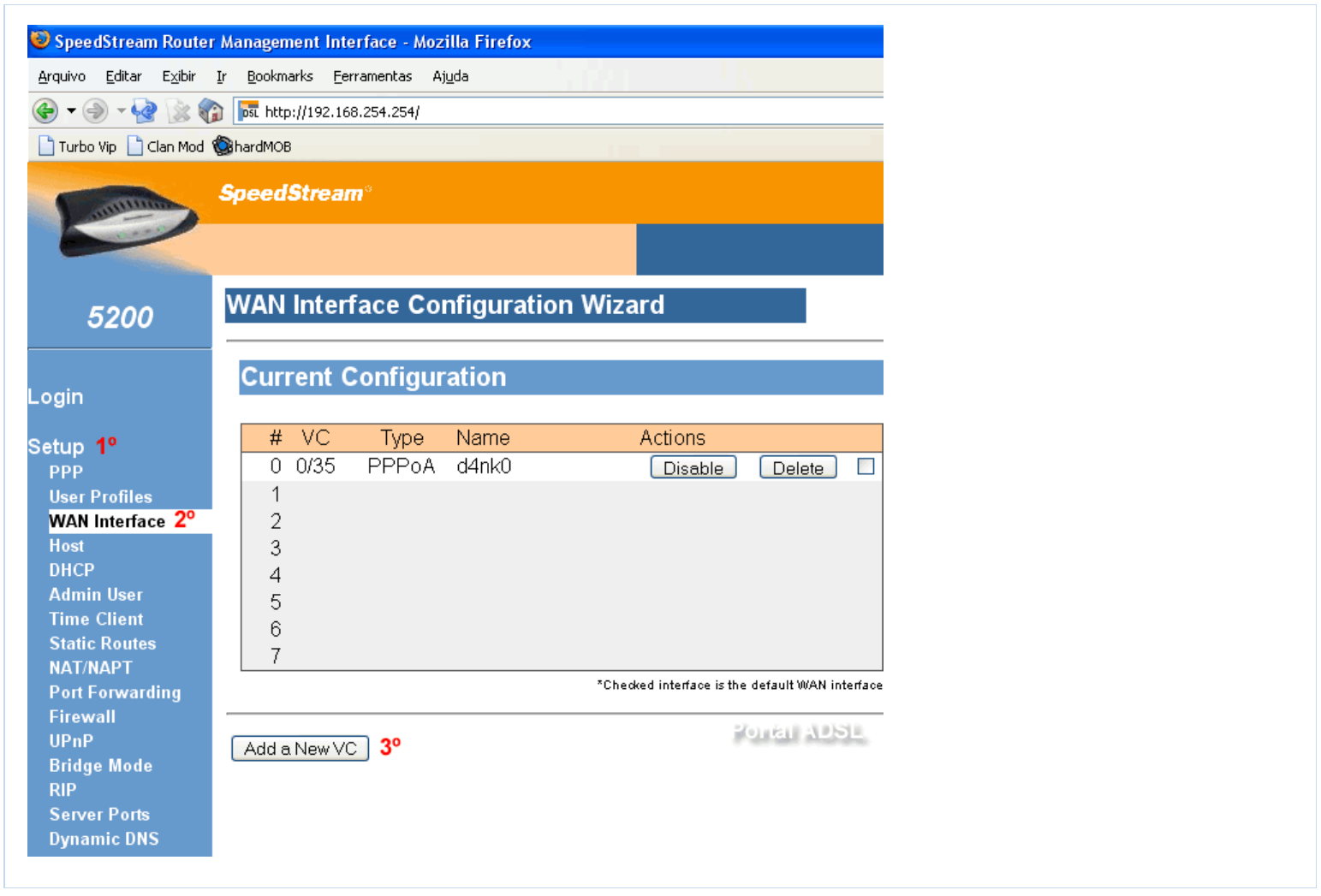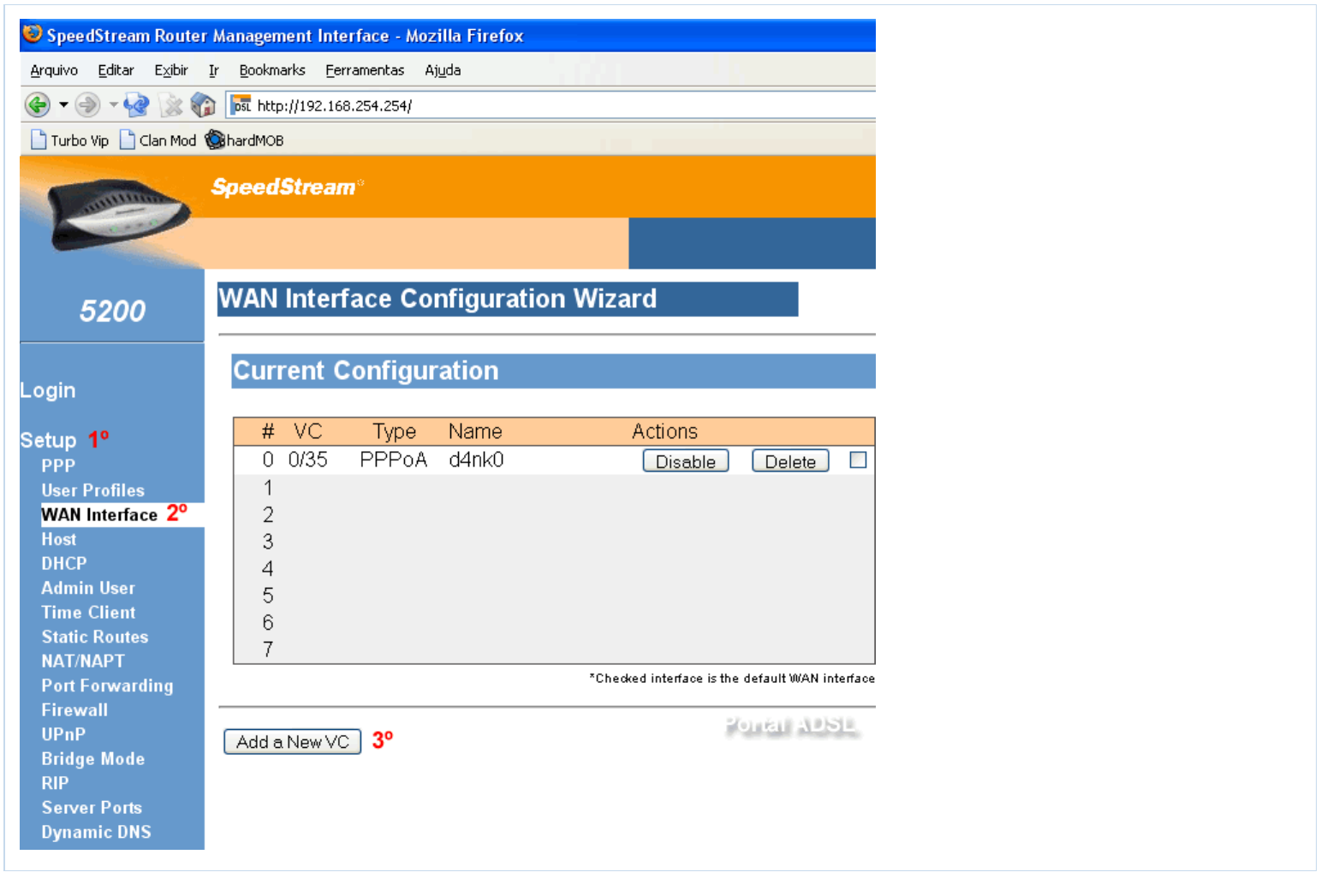 1 - Clique em "Setup", WAN Interface e em seguida clique em "ADD a New VC";