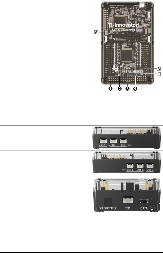 •TI-Innovator™ 组件。这些组件(单独出售)包括通过 I/O 端口和试验板连接