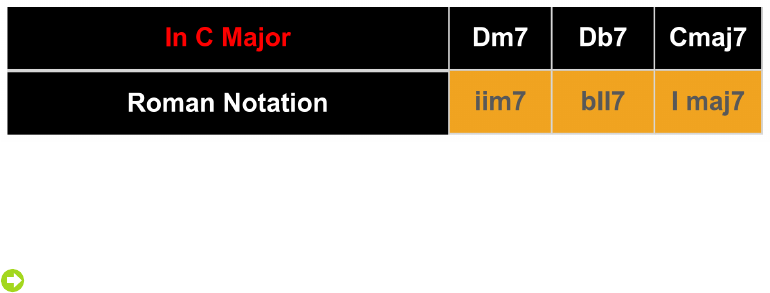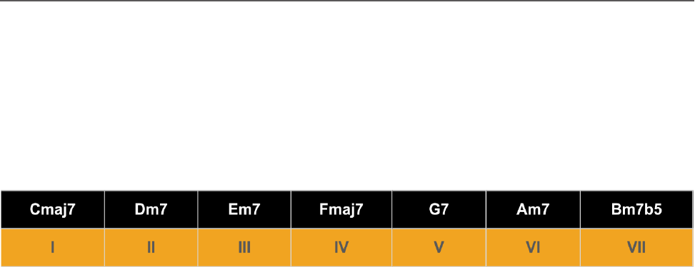 • Capital Roman Numerals (Imaj7, IVmaj7, V7): are used to indicate Major and