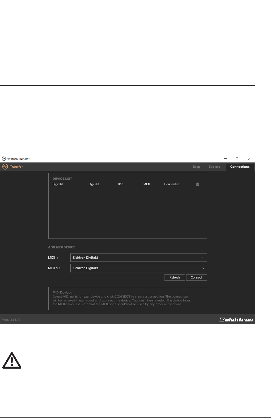 3. On the Transfer CONNECTIONS page, set the MIDI IN and OUT ports to your Elektron device.