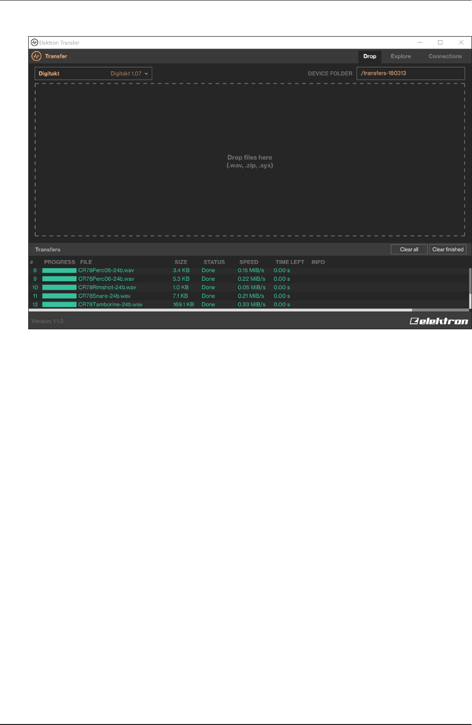 You can also transfer SysEx files to your Elektron device using the DROP page in Transfer. This func-