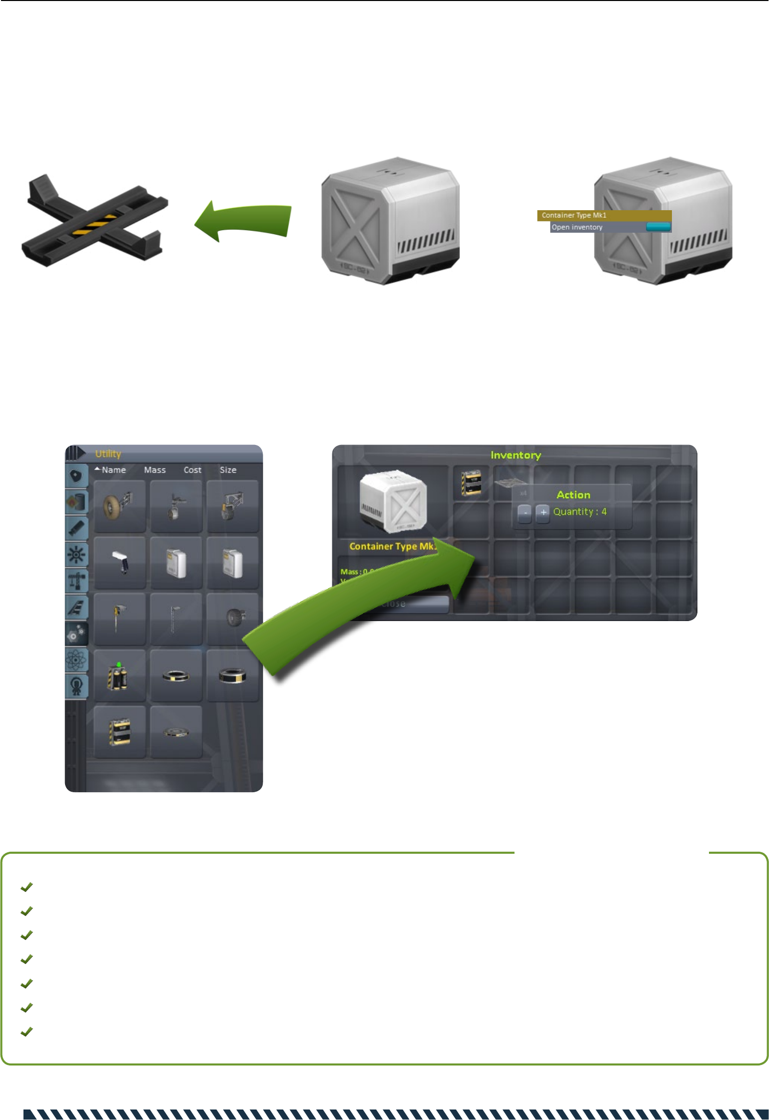 - Inventory for every crew member to store multiple parts and items.