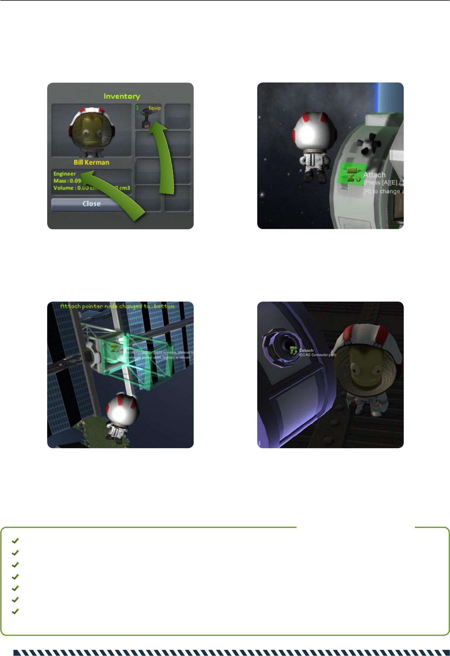 - EVA items and tools : Equip your Kerbals and use tools as electrical screwdriver and more...