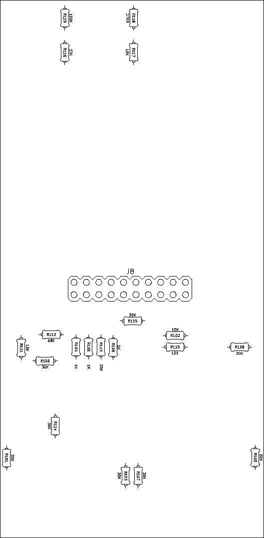 8 R100,R101,R103,R107,R108,R109,R114,R115 8 30K 1/8W, 3.3mm length, or SMT 0805 (Front only) Mouser 270-30K-RC http://www.mouser.com/ProductDetail/Xicon/270-30K-RC/?qs=sGAEpiMZZMu61qfTUdNhG3rFkoq2Hf1ayuDgvp4lvkI%3d | Digikey S30KCACT-ND https://www.digikey.com/products/en?keywords=S30KCACT-ND