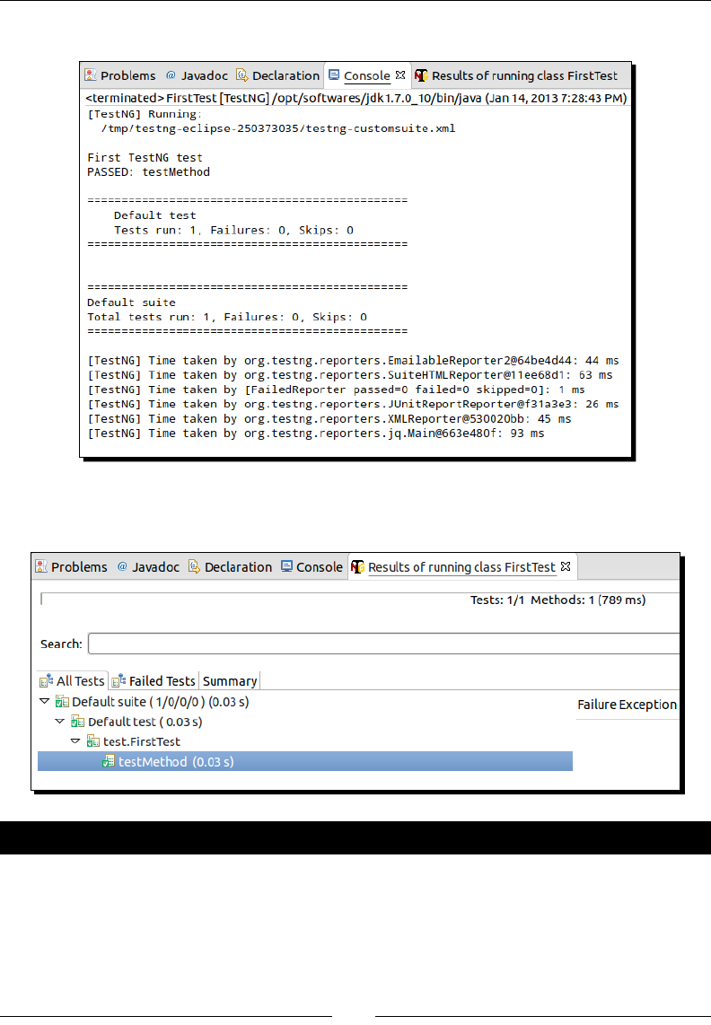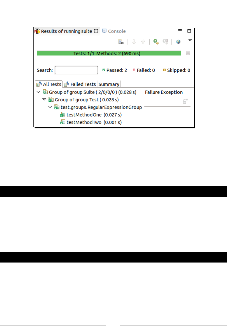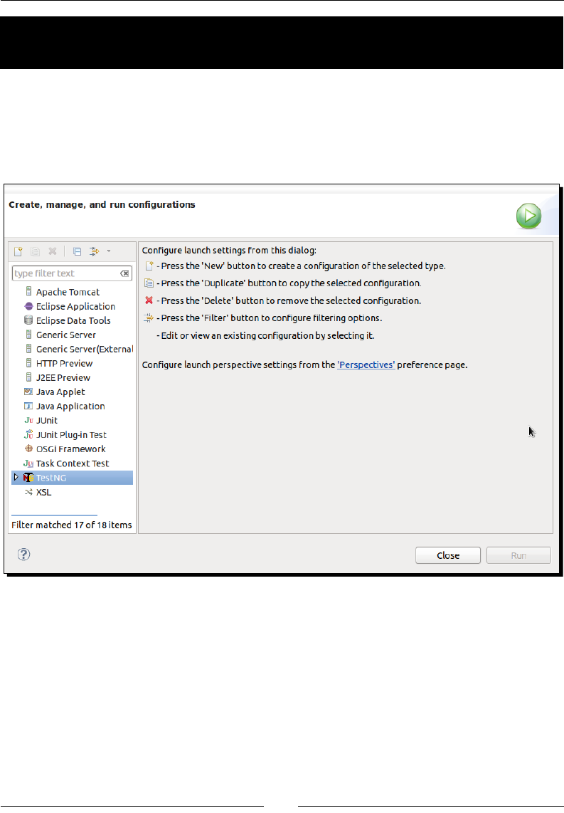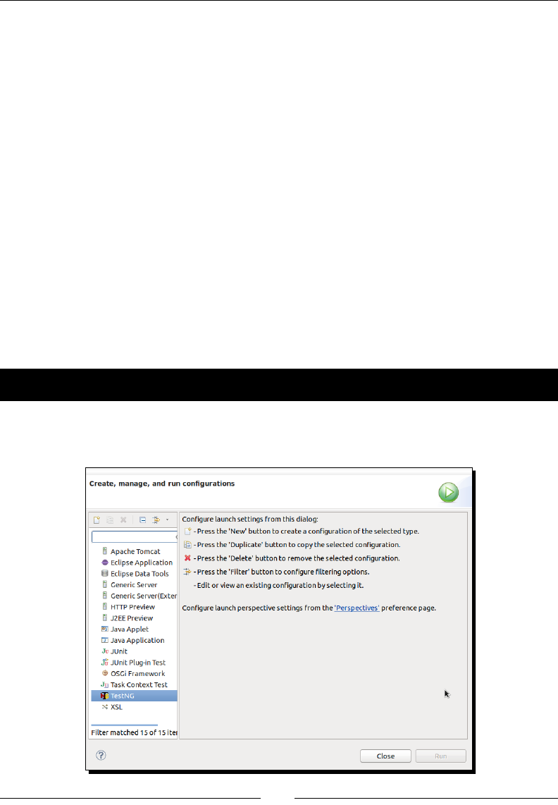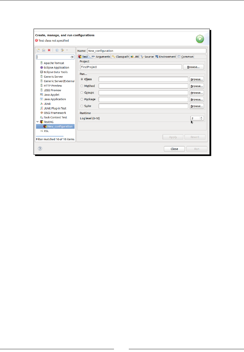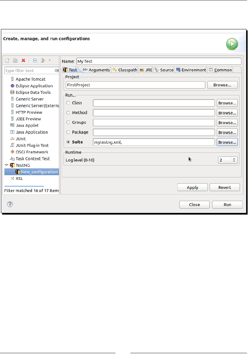 - Time for action – configuring Eclipse to run a particular TestNG XML file