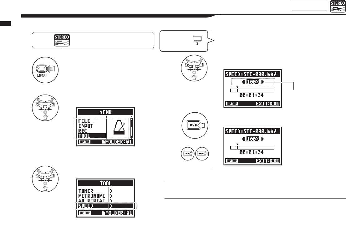 Use the SPEED function to adjust the playback speed from 50–150%. The