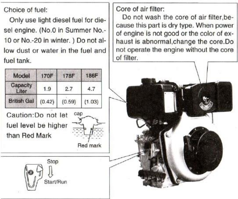 Our four stroke diesel engines are air cooled with a direct fuel injected intake system.