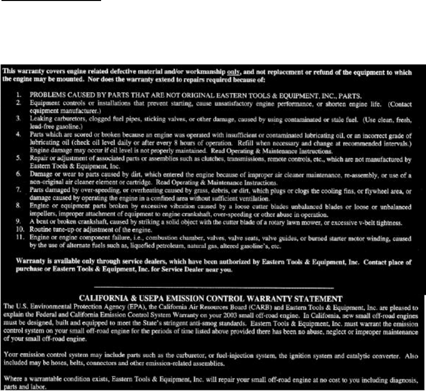 Eastern Tools & Equipment, Inc. will repair or replace, free of charge, any part or parts of the generator that are defective in